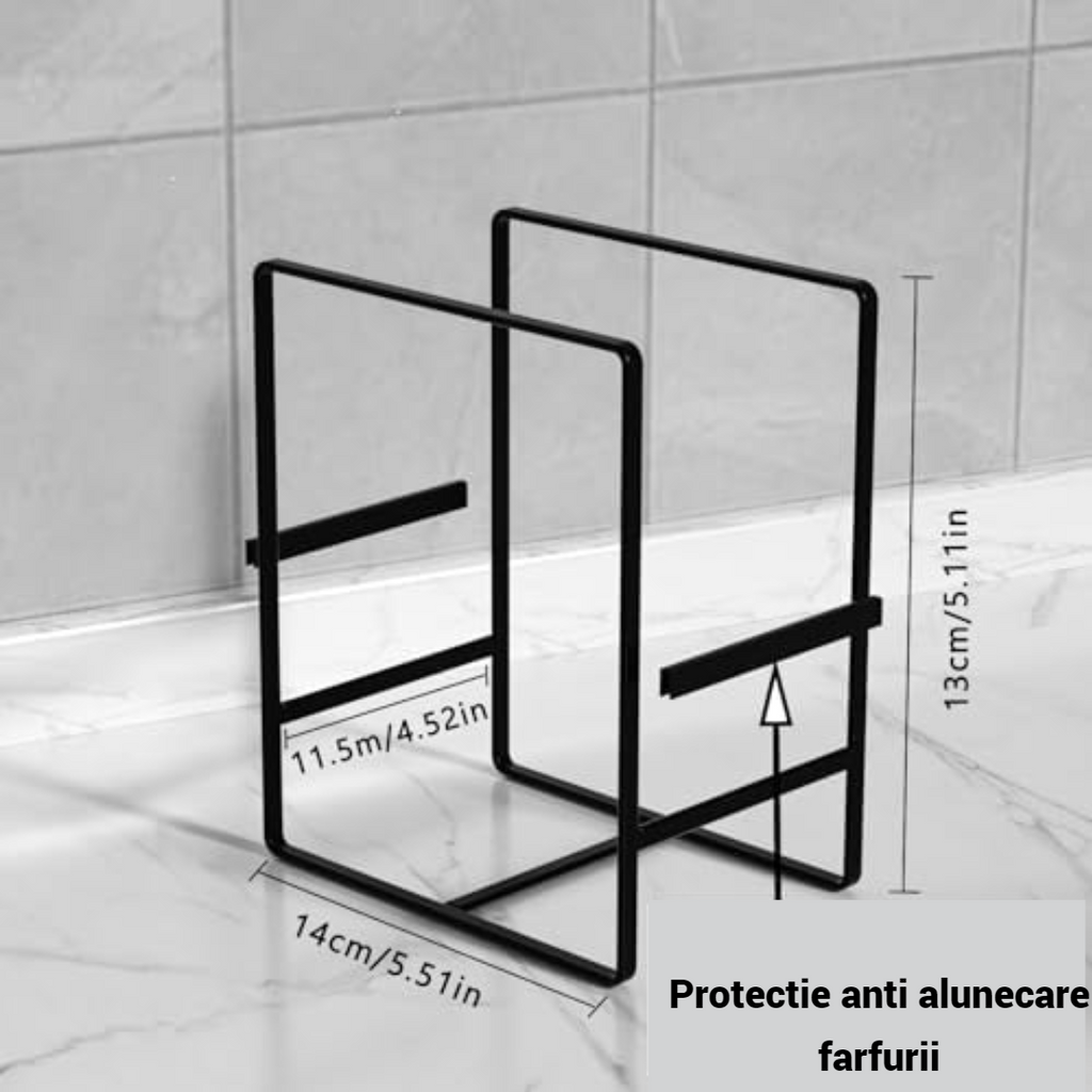 Organizatorul vertical pentru suport de farfurii vine cu căptușeli de protecție din cauciuc durabile, anti-alunecare eficientă, protejează vasele. Design simplu, crește valoarea bucătăriei moderne.