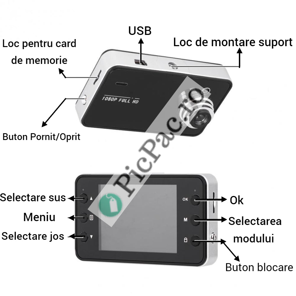 Dispozitivul se ataseaza de parbrizul masinii cu ajutorul suportului cu ventuza care este inclus in pachet. Pentru a porni/opri camera trebuie sa apasati butonul On/Off. Pentru a inregistra audio-video trebuie sa apasati pe butonul "Rec". Daca doriti sa modificati caracteristicile filmarii, puteti intra in Meniul camerei auto apasand pe butonul "Menu".