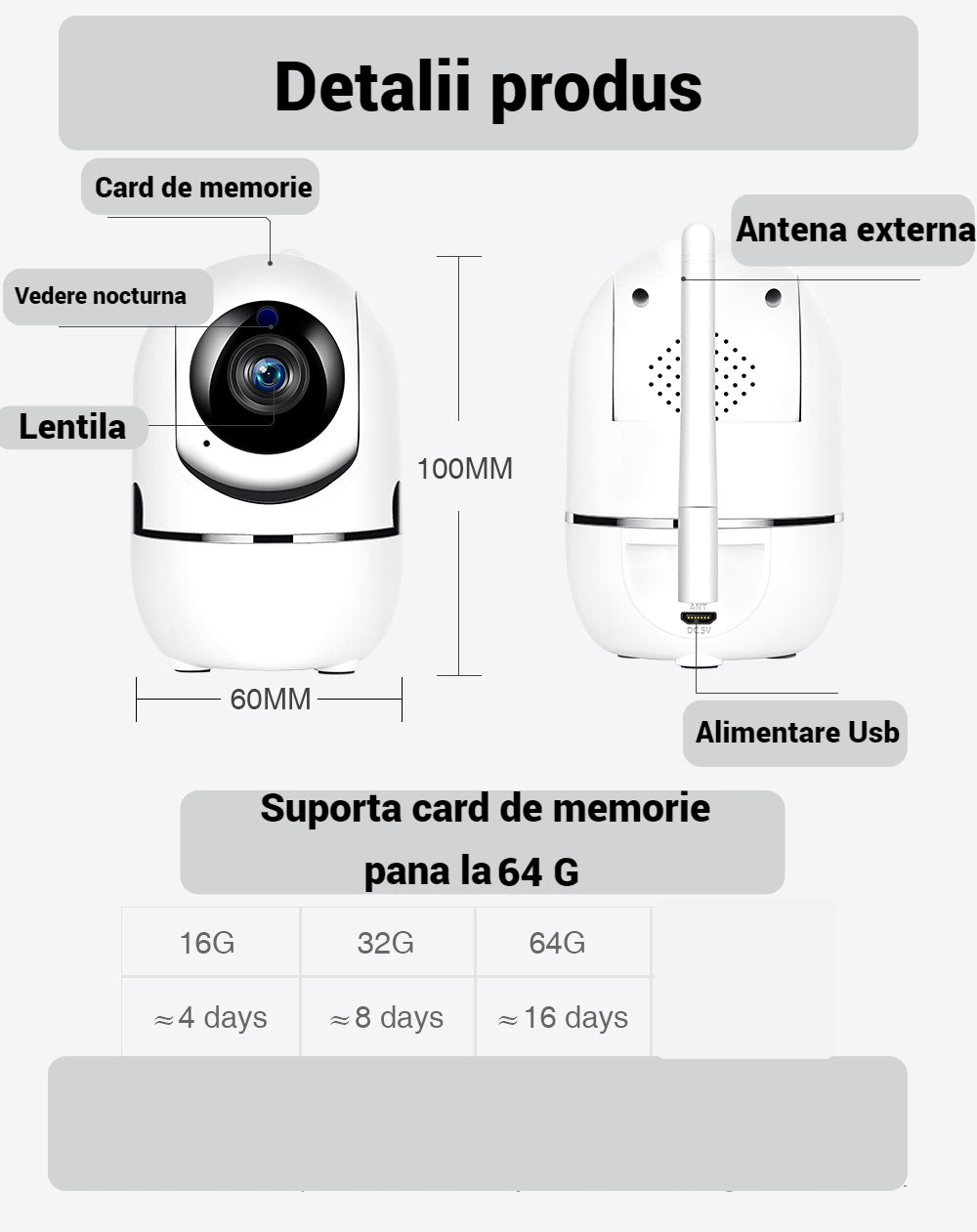 Detectare mișcare, setare de înregistrare în buclă, vedere pe timp de noapte IR, sunet bidirecțional