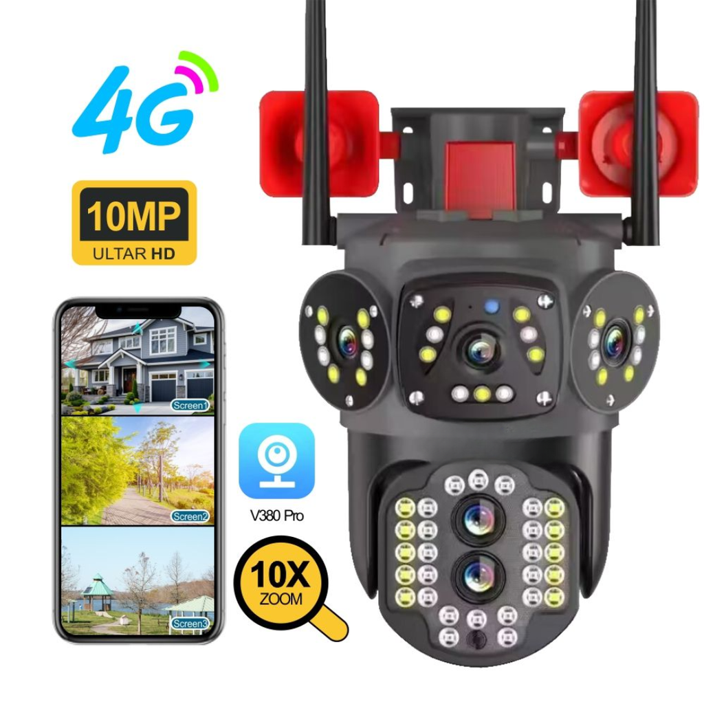 O cameră de securitate pentru exterior HD cu trei ecrane, PTZ, Wi-Fi, camera IP, interfon, audio cu două căi, impermeabilă, viziune nocturnă, urmărirea mișcării și difuzoare duble reprezintă soluția ideală pentru a-ți asigura siguranța și pacea în locuința ta.