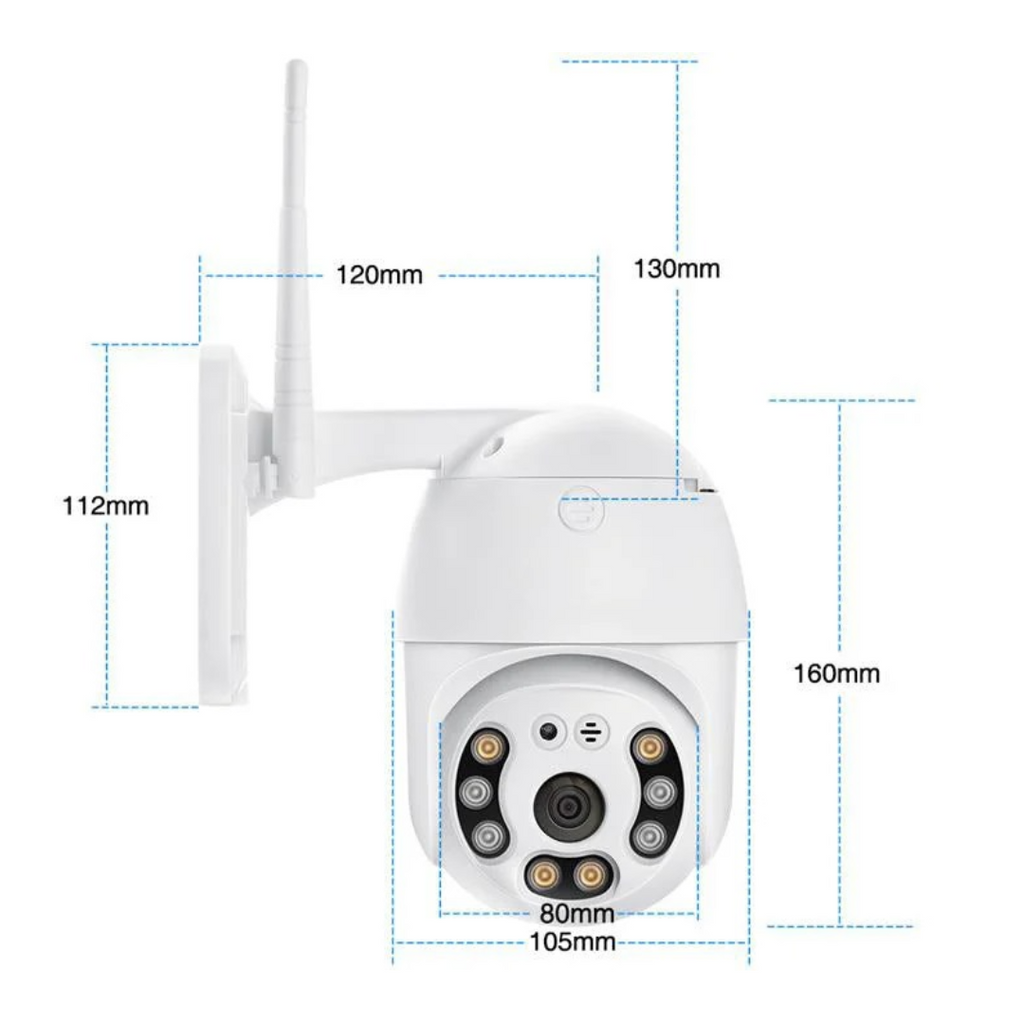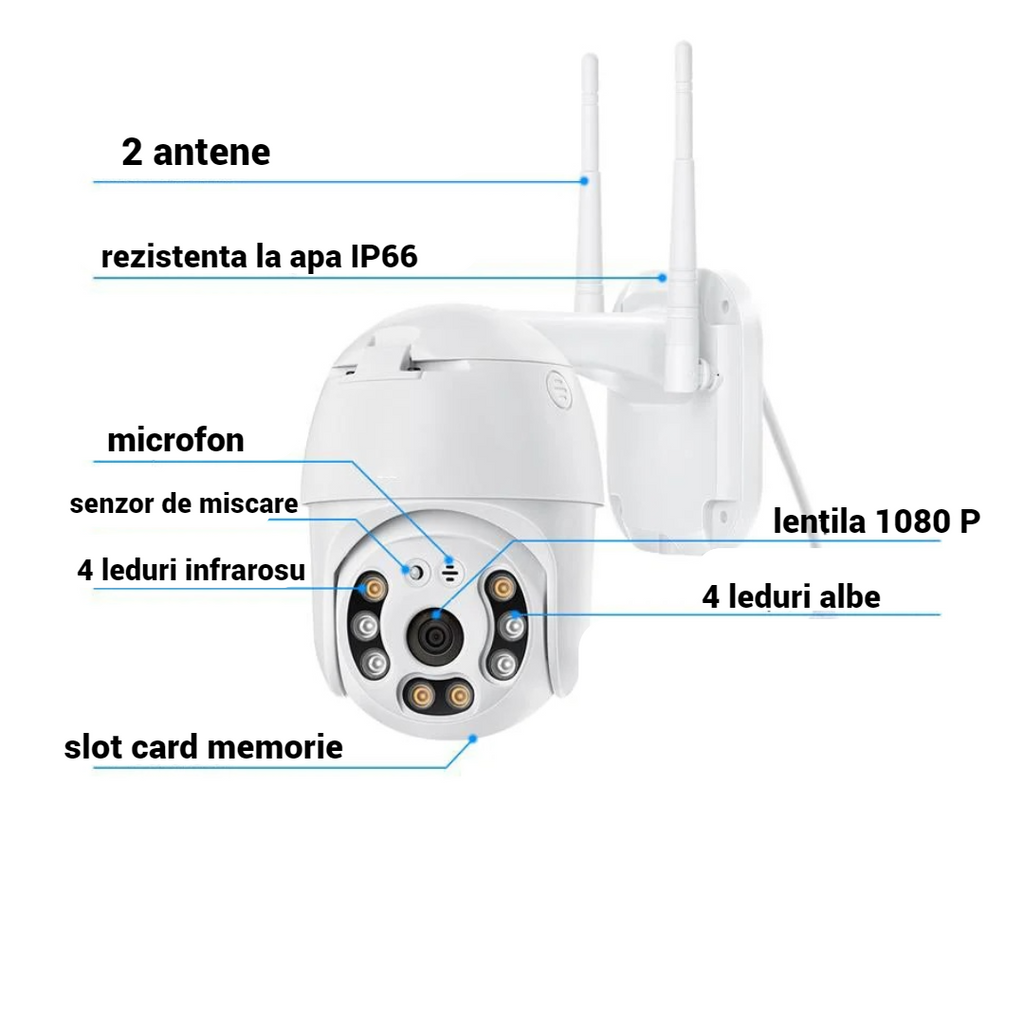 Poate fi urmarita si comandata de la distanta, prin telefon. Din aplicatia de pe telefon poate fi rotita, atat in plan orizontal, cat si vertical.