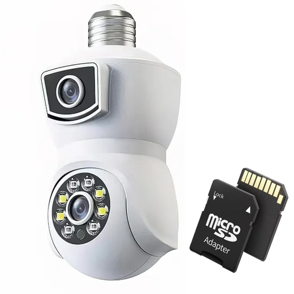 Pachet promo! Cameră cu bec Wifi în aer liber cu lentilă duală E9 Cameră cu bec Liqht Home 1080P PTZ 2MP Cameră CCTV, monitorizare sincronă cu ecran dublu și canal dublu, urmarire umana, fasung E27, utilizare interior / exterior + Card memorie 32 GB