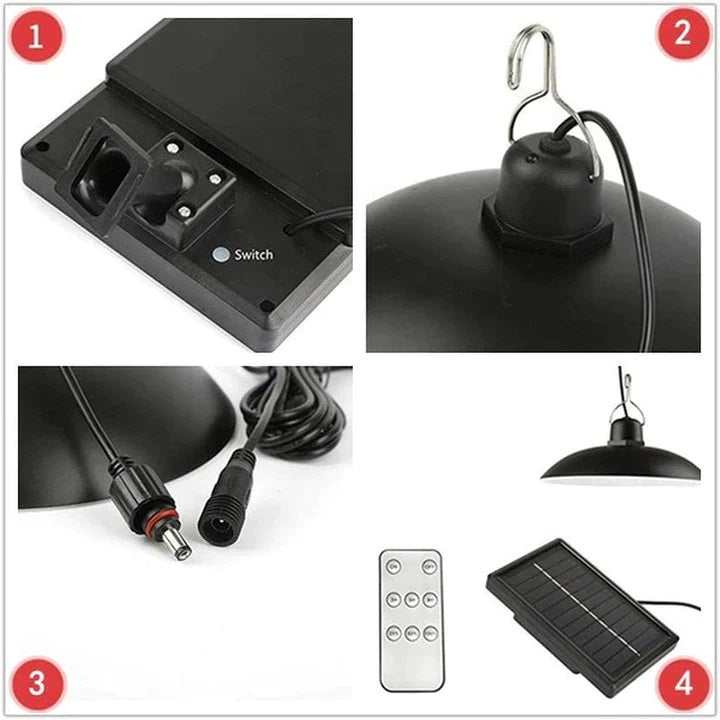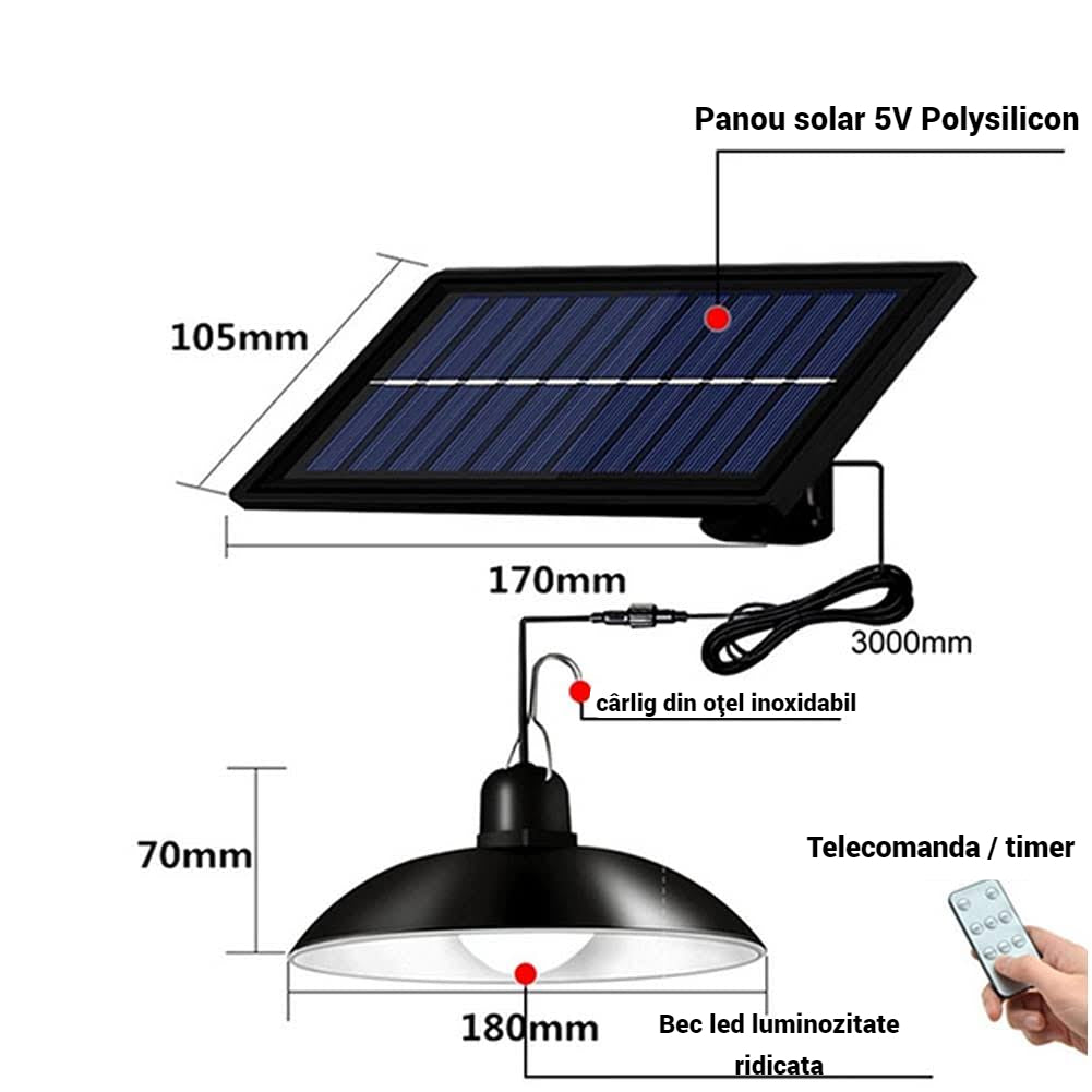 Lampa solara suspendata este potrivita ca sursa de iluminat pentru gradini, curti, balcoane, case, insule de bucatarie, coridoare, restaurante, dormitoare, cafenele, baruri, cluburi. Acest produs este controlat de la distanta cu telecomanda, nu are senzor de lumina/miscare.