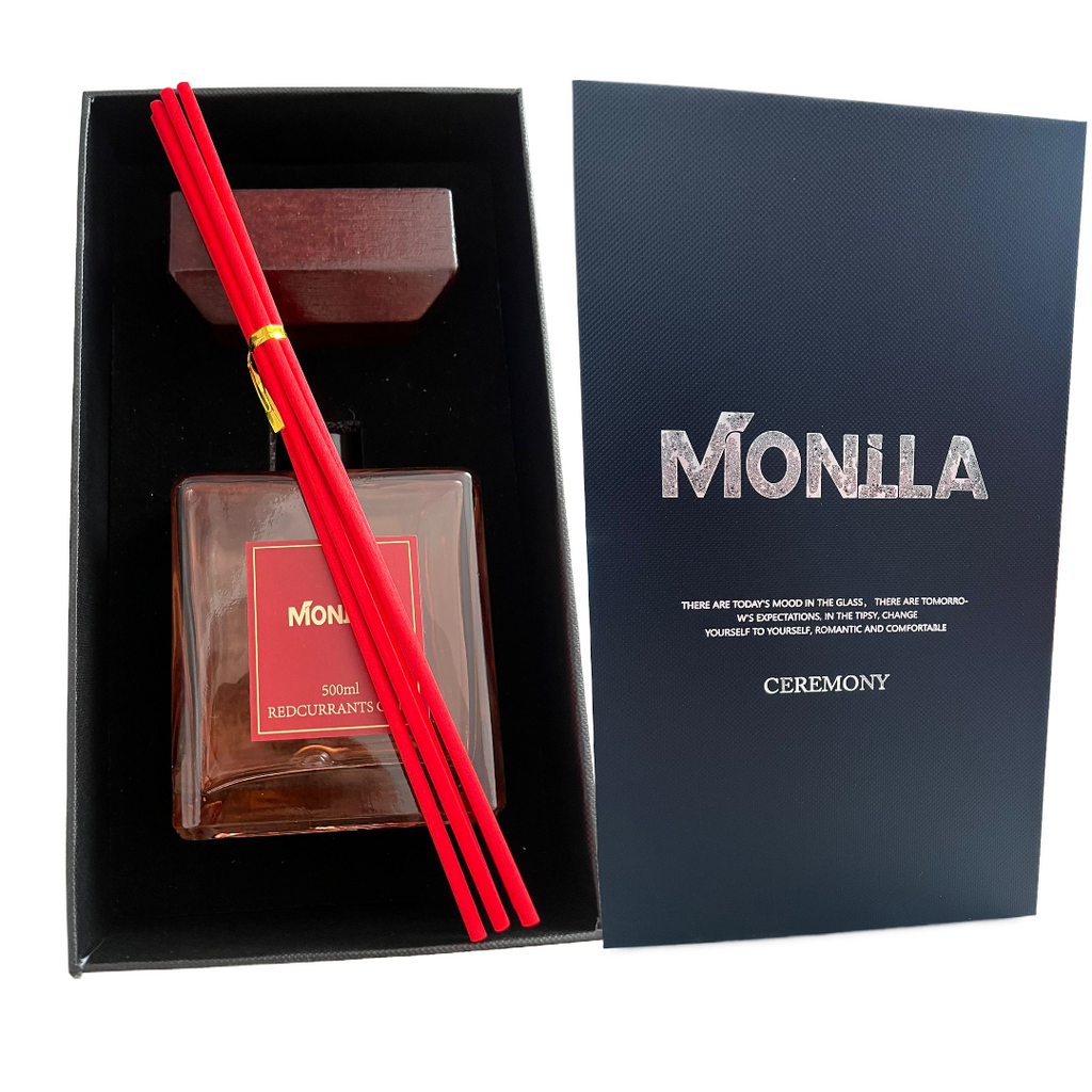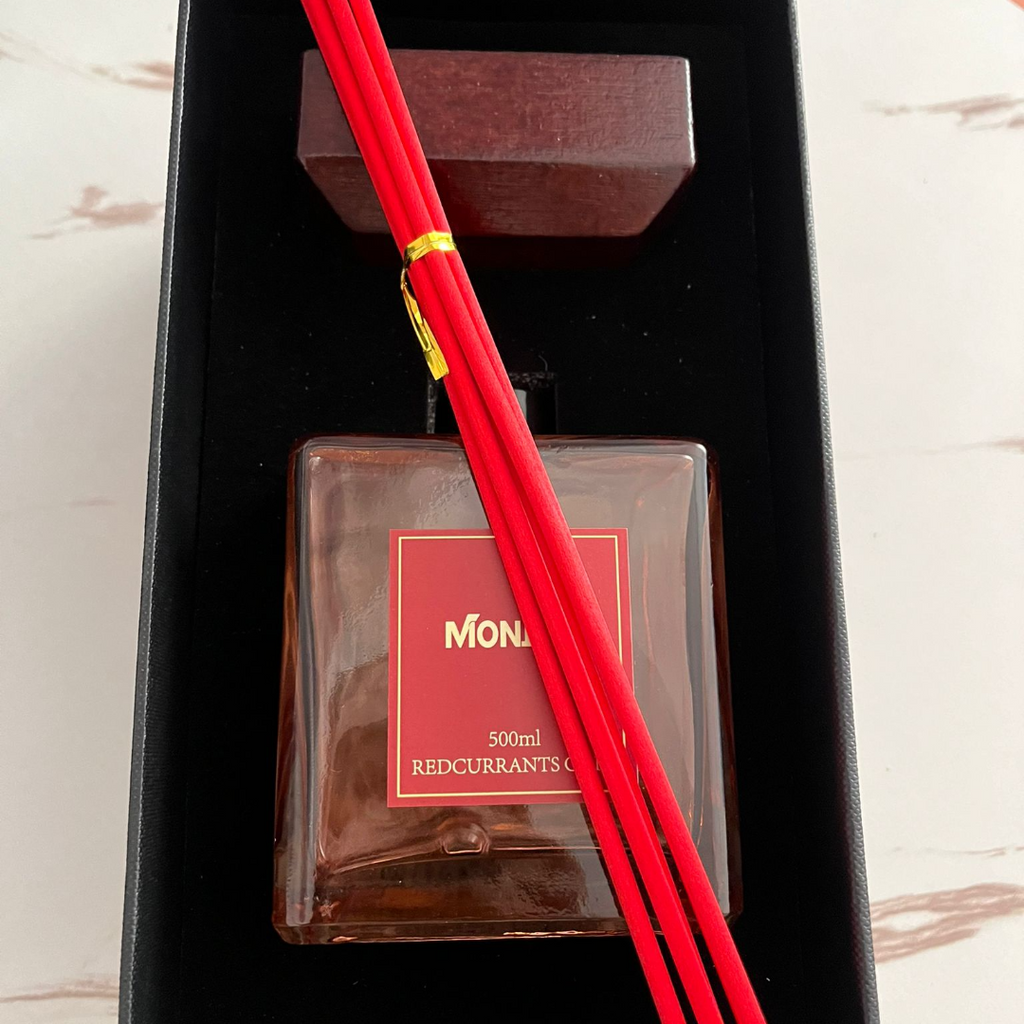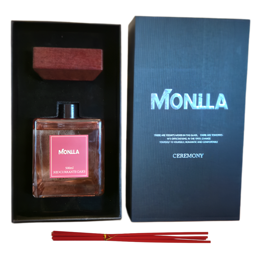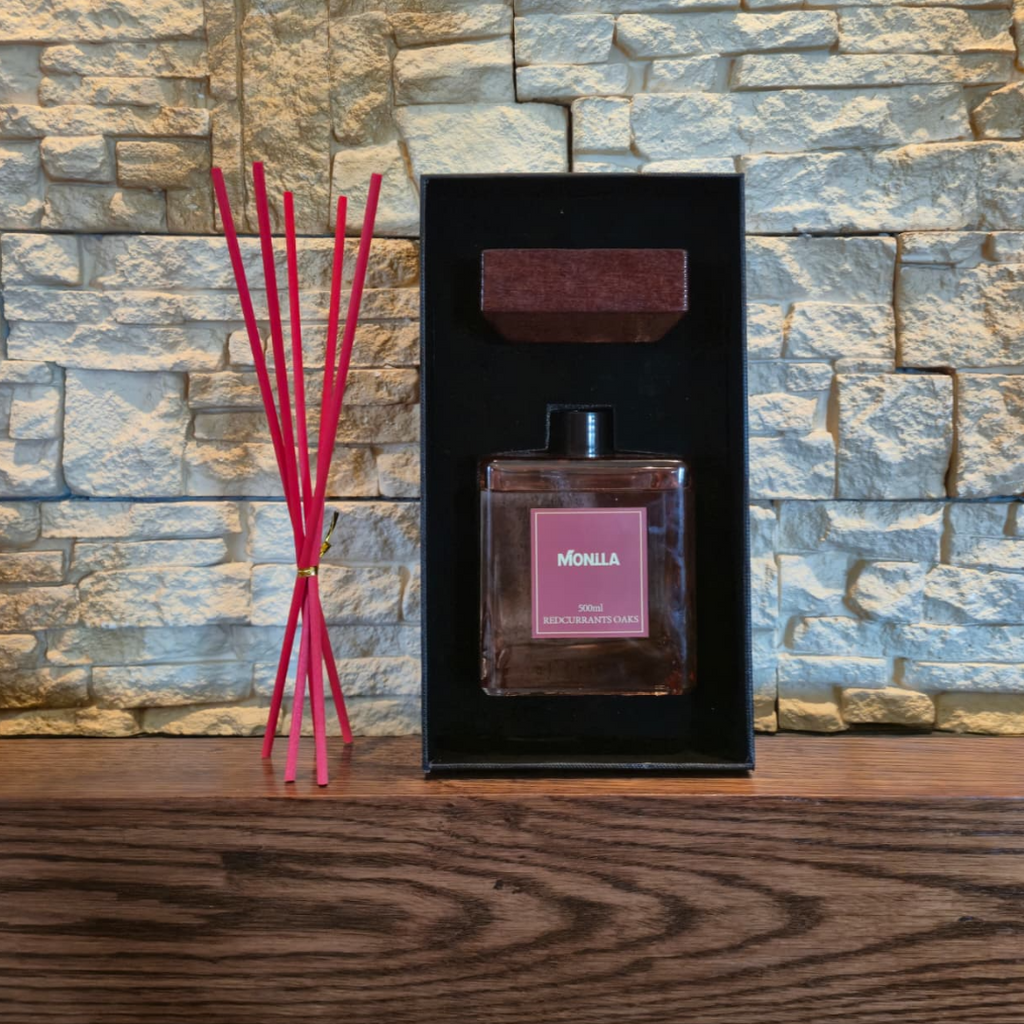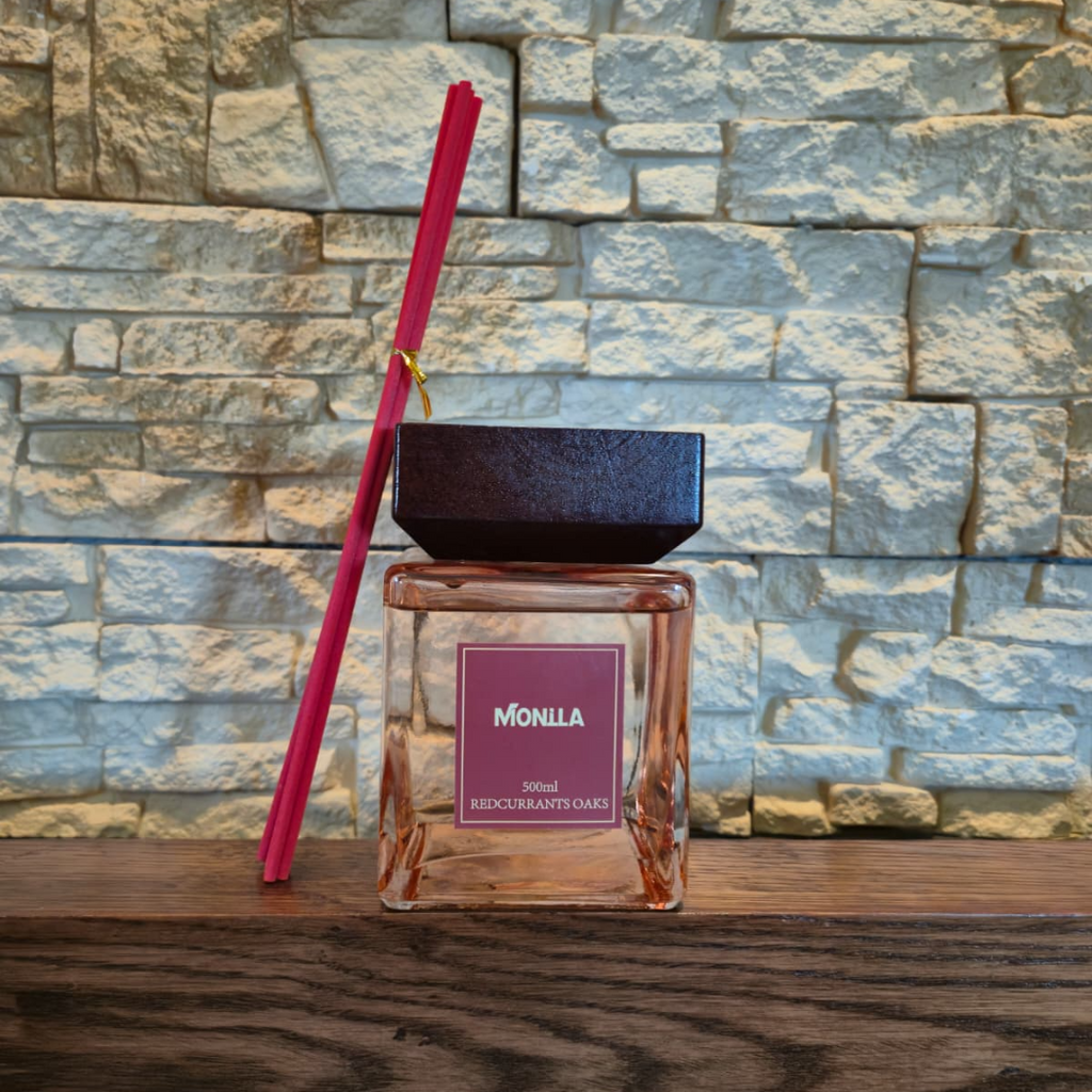 Parfum de cameră Monilla Redcurrants Oaks 500 ml cu bețișoare parfumate – Aromă rafinată de coacăze roșii și stejar