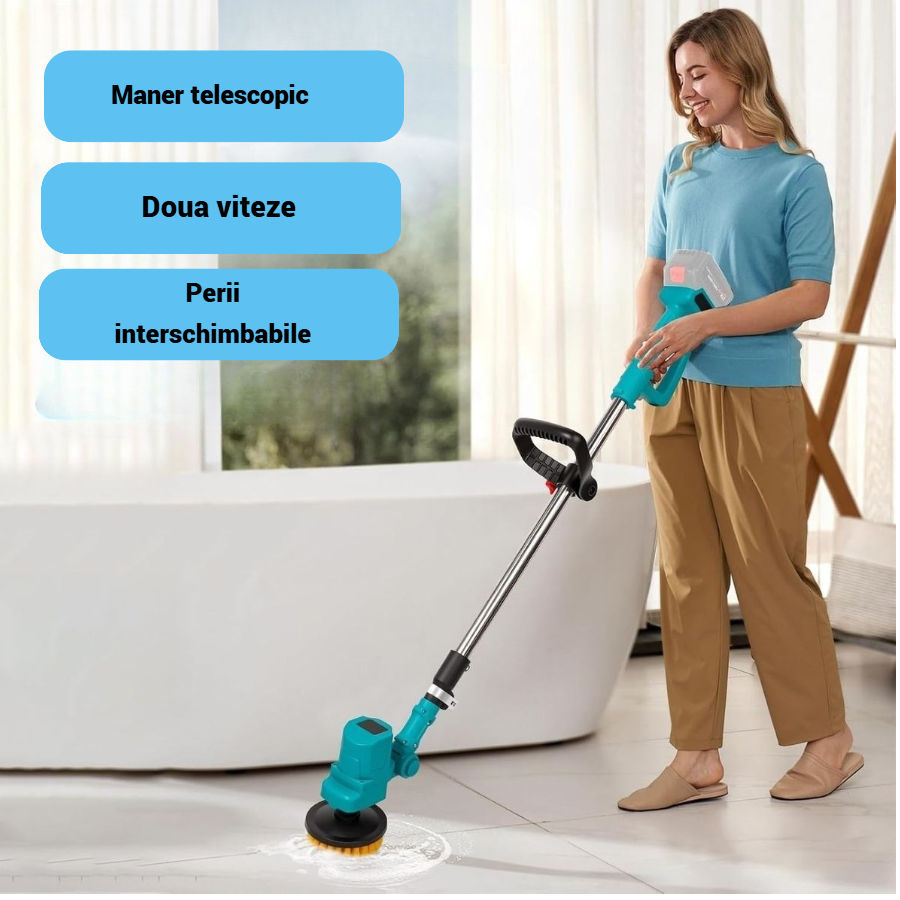 Scapa de curatarea obositoare cu buretele sau peria manuala! Peria Electrica Multifunctionala pe acumulatori de 88V este solutia ideala pentru o curatenie rapida, fara efort si eficienta.