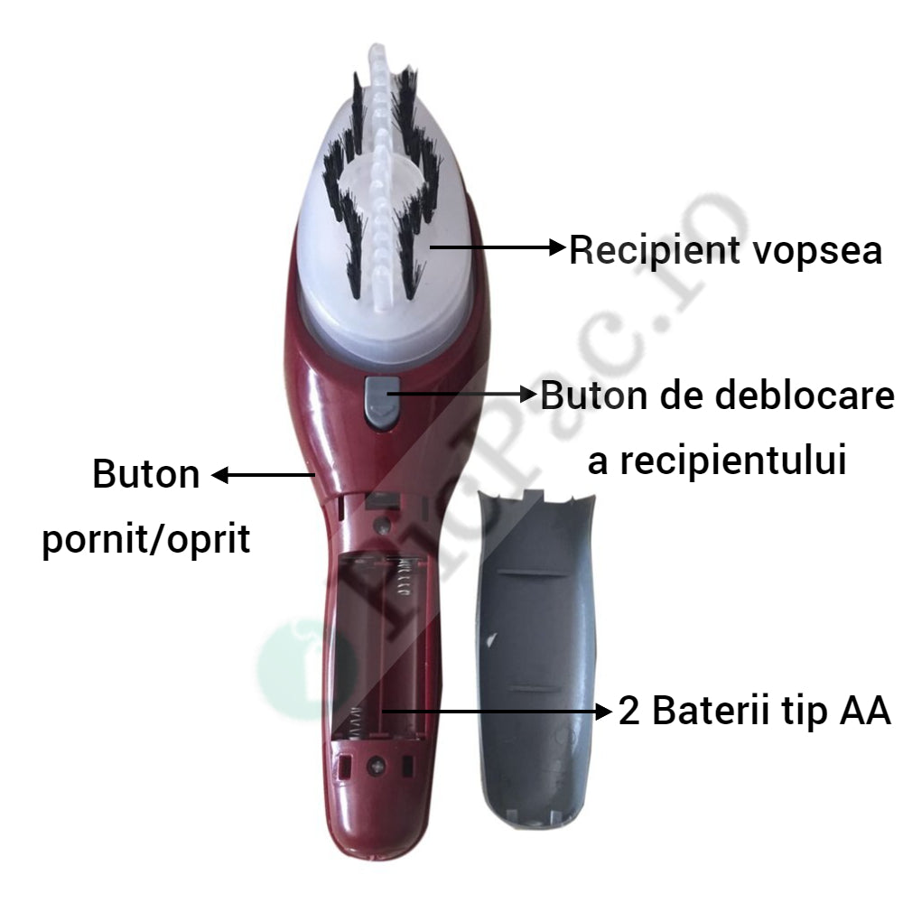 Peria are un compartiment in care se pune vopseaua, apoi cu o singura miscare de pieptanare, vopseaua va fi distribuita uniform in profunzimea firului de par.