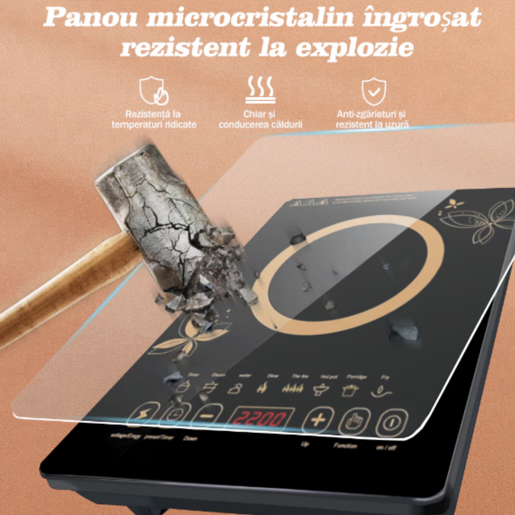 Aragazul cu inductie este echipat cu un senzor LCD digital avansat, care va permite sa selectati liber modul de gatire a alimentelor si puterea prin intermediul functiei tactile. 200W-2200W - Exista 10 niveluri de putere, atingeti pentru a creste sau a reduce treptat puterea temperaturii. Modul de gatit si temperatura pot fi selectate. Atingeti afisajul pentru a regla cu usurinta temperatura, facandu-l usor de utilizat.