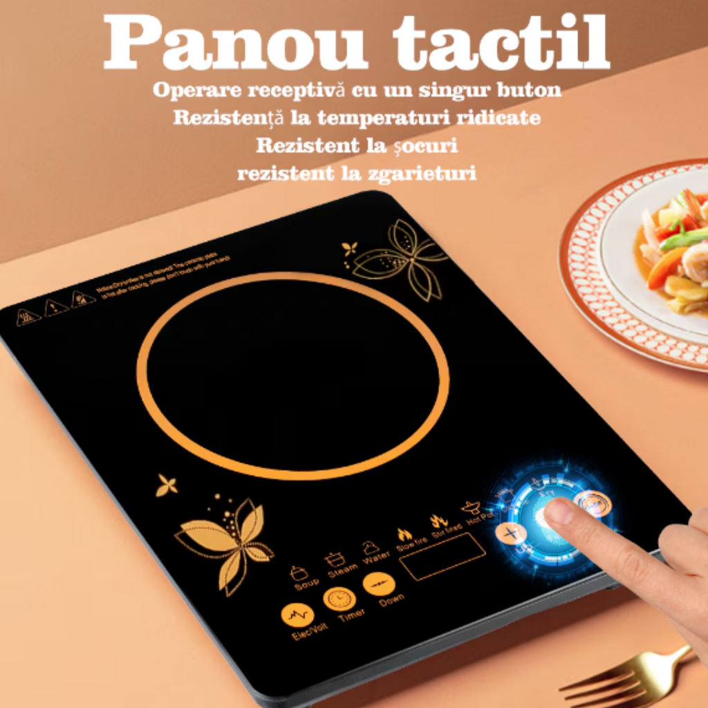 Plitele cu inductie sunt potrivite pentru a gati aproape orice fel de mancare, cu o varietate de optiuni si functii alimentare selectabile. 200 W la 2200 W, trepte diferite, reglare control tactil. Exista 8 functii din care puteti alege: supa, fierbere la abur, apa clocotita, foc mic, foc mare, oala fierbinte, terci si prajire. Optiuni optionale ale panoului tactil: putere/tensiune, rezervare/temporizare, reducere a puterii, cresterea puterii, selectare functii, pornire si oprire. Functii multiple pentru a va ajuta sa satisfaceti nevoile familiei dvs.