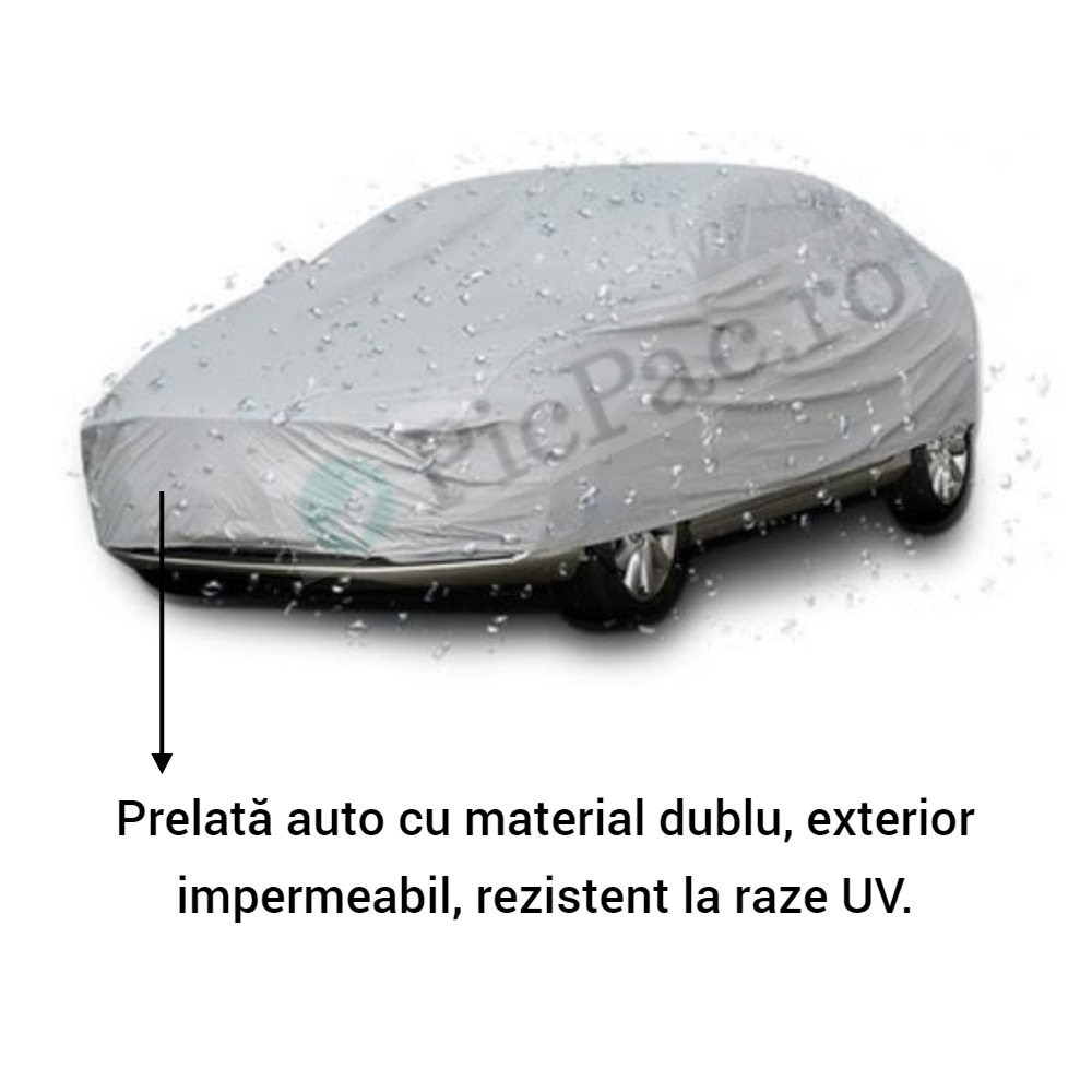 Prelata auto cu material dublu, exterior impermeabil, rezistent la raze UV, interior anti-zgarieturi, prindere cu elastic in colturile masinii.
