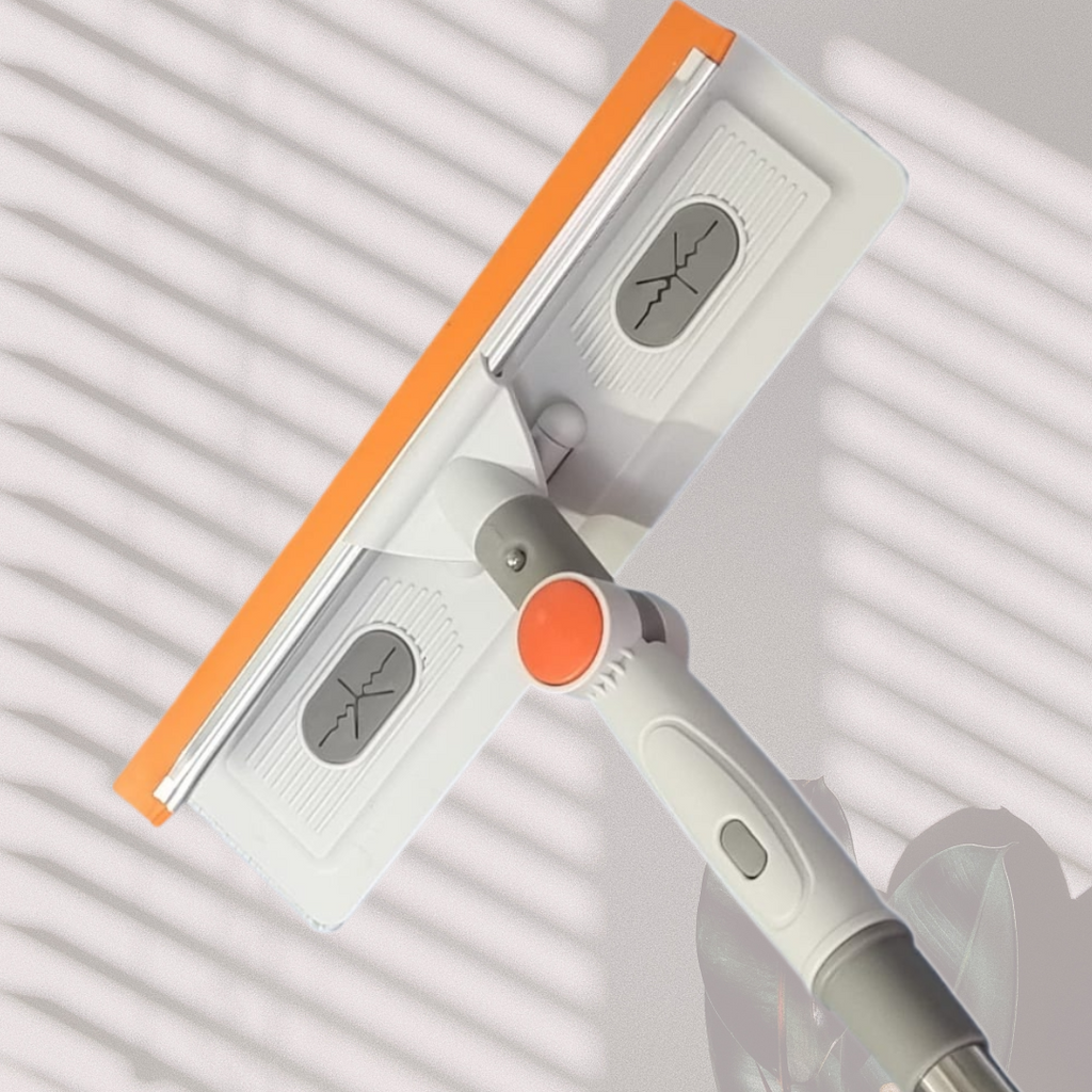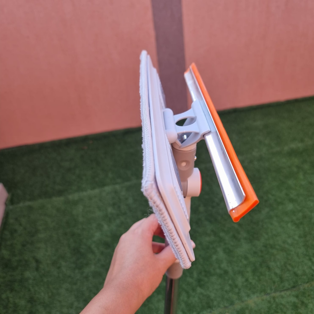 Cap rotativ la 180 de grade: apăsați butonul, rotiți capul de curățare a geamurilor la un unghi adecvat și eliberați-l pentru a-l bloca. Apoi puteți curăța toate tipurile de ferestre, cabine de dus, oglinzi, podele, etc.