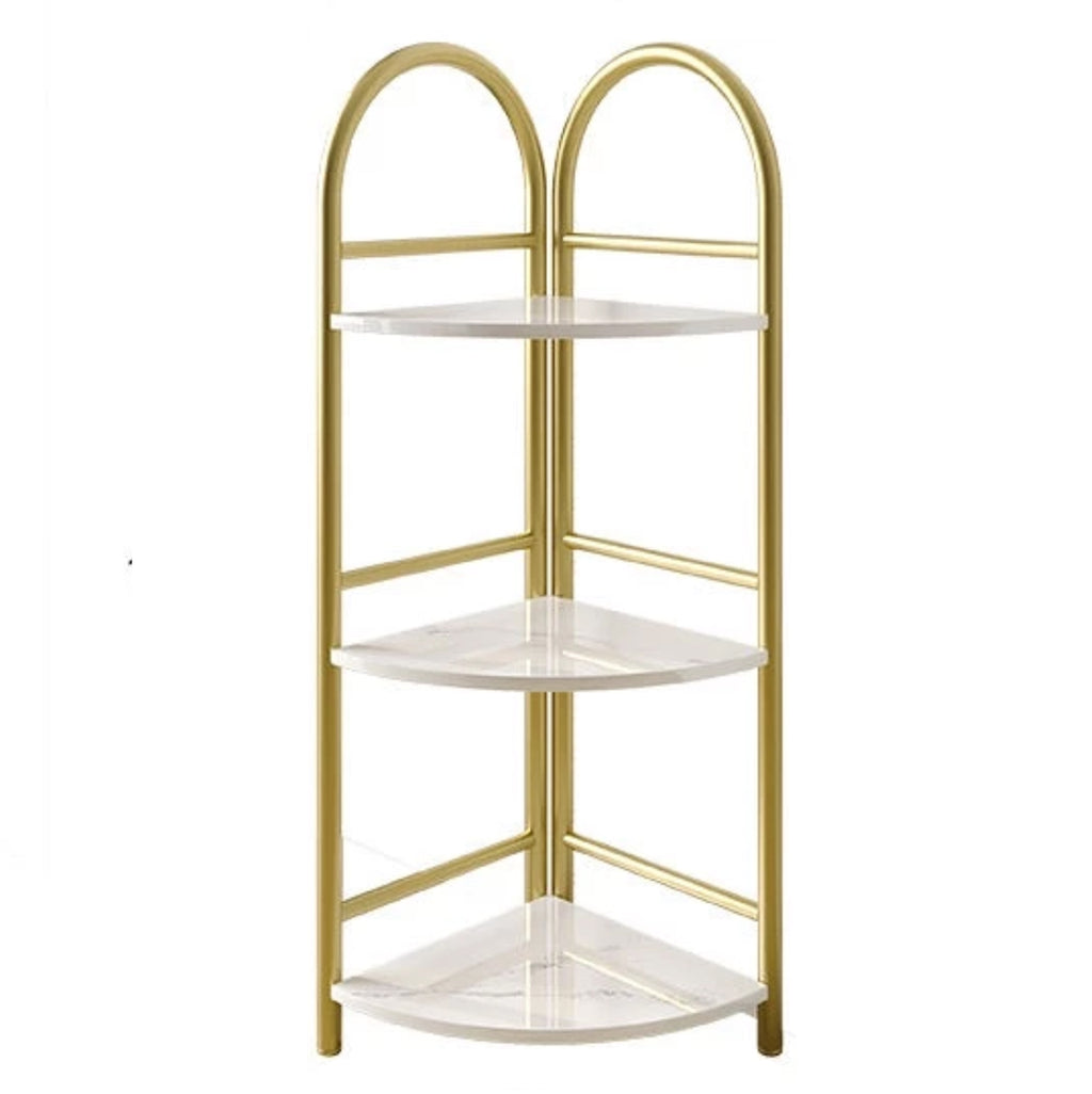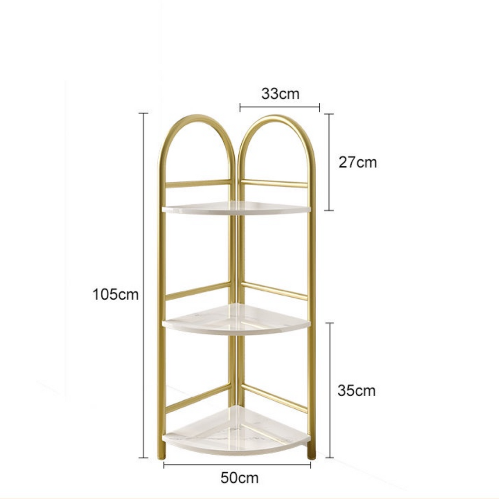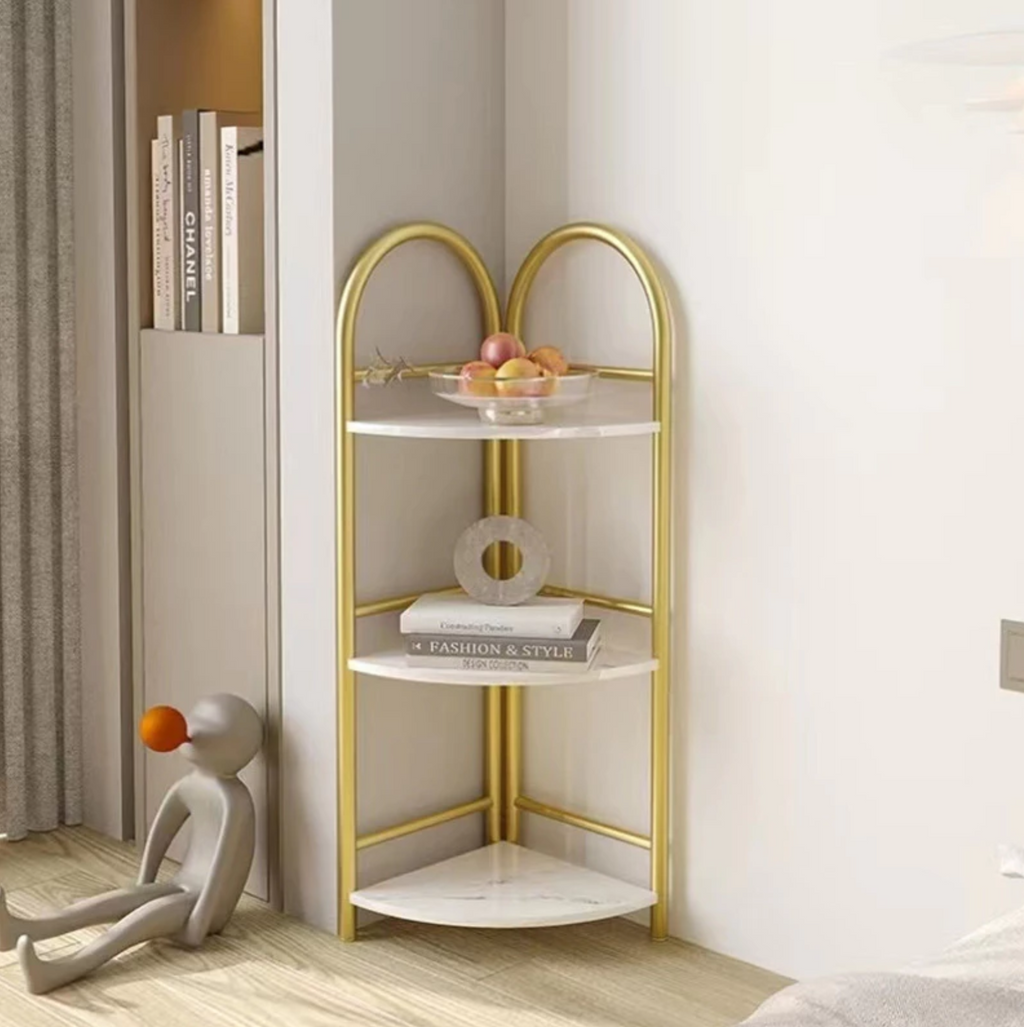Finisajul auriu adaugă un aer de lux, iar efectul marmură al rafturilor aduce o notă de eleganță subtilă. Designul de colț economisește spațiu, făcându-l perfect pentru livinguri, birouri sau holuri, integrându-se ușor în orice decor modern sau clasic.