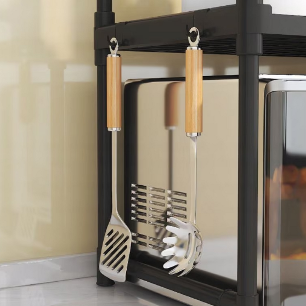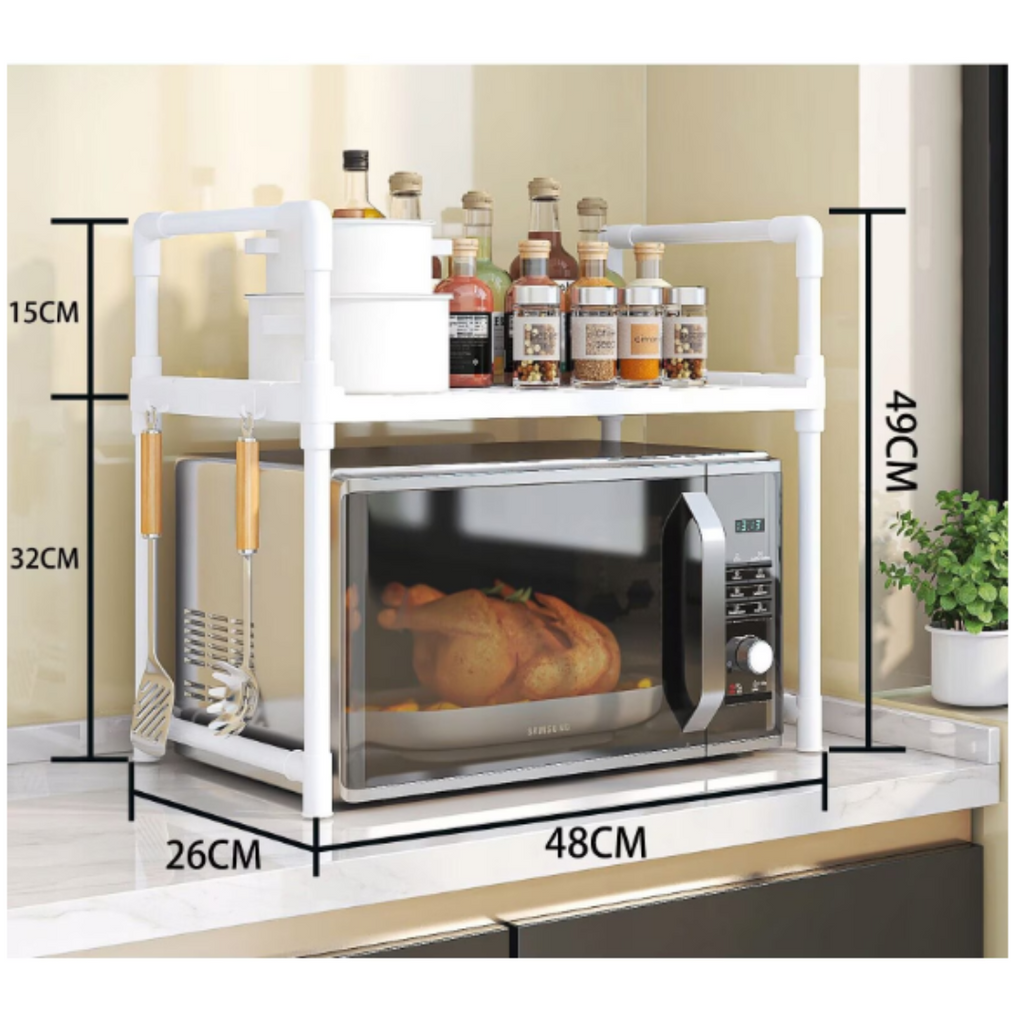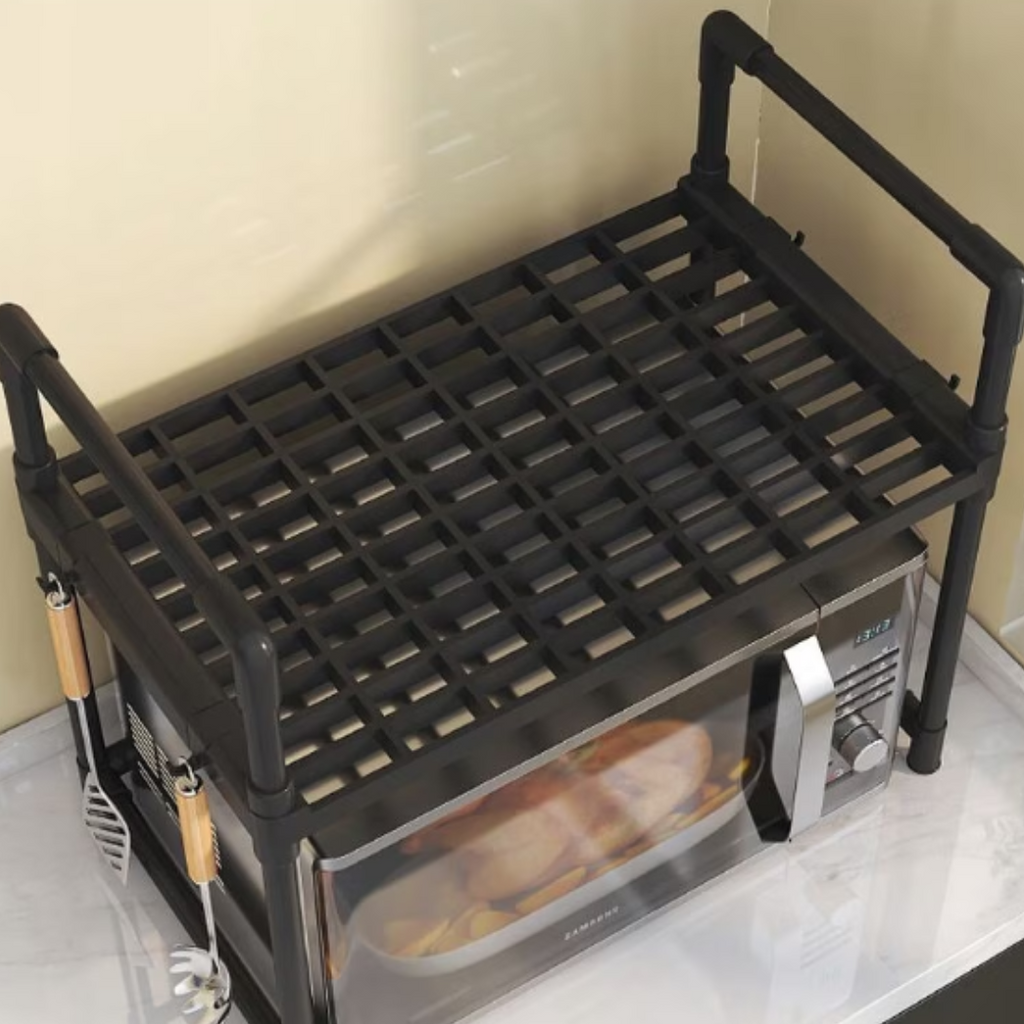 Acest raft pentru cuptor cu microunde este o alegere excelenta pentru oricine doreste sa-si optimizeze spatiul de depozitare in bucatarie. Cu un design simplu si elegant, acest raft poate fi plasat in aproape orice cuptor cu microunde, permitandu-ti sa depozitezi cu usurinta alimente, farfurii si alte articole de bucatarie.