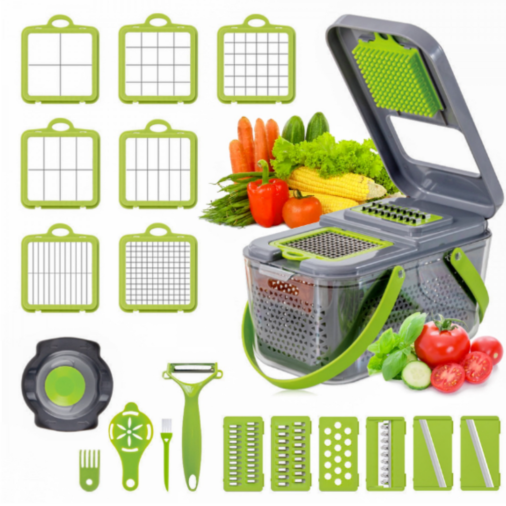 Veggie Slicer este o răzătoare multifuncțională pentru legume care vine cu 22 de accesorii diferite, ceea ce îți permite să tai, să feliezi, să juliennezi și să radeți legumele într-o varietate de forme și dimensiuni. Această răzătoare este ideală pentru a face salate, garnituri sau pentru a pregăti legumele pentru gătit.
