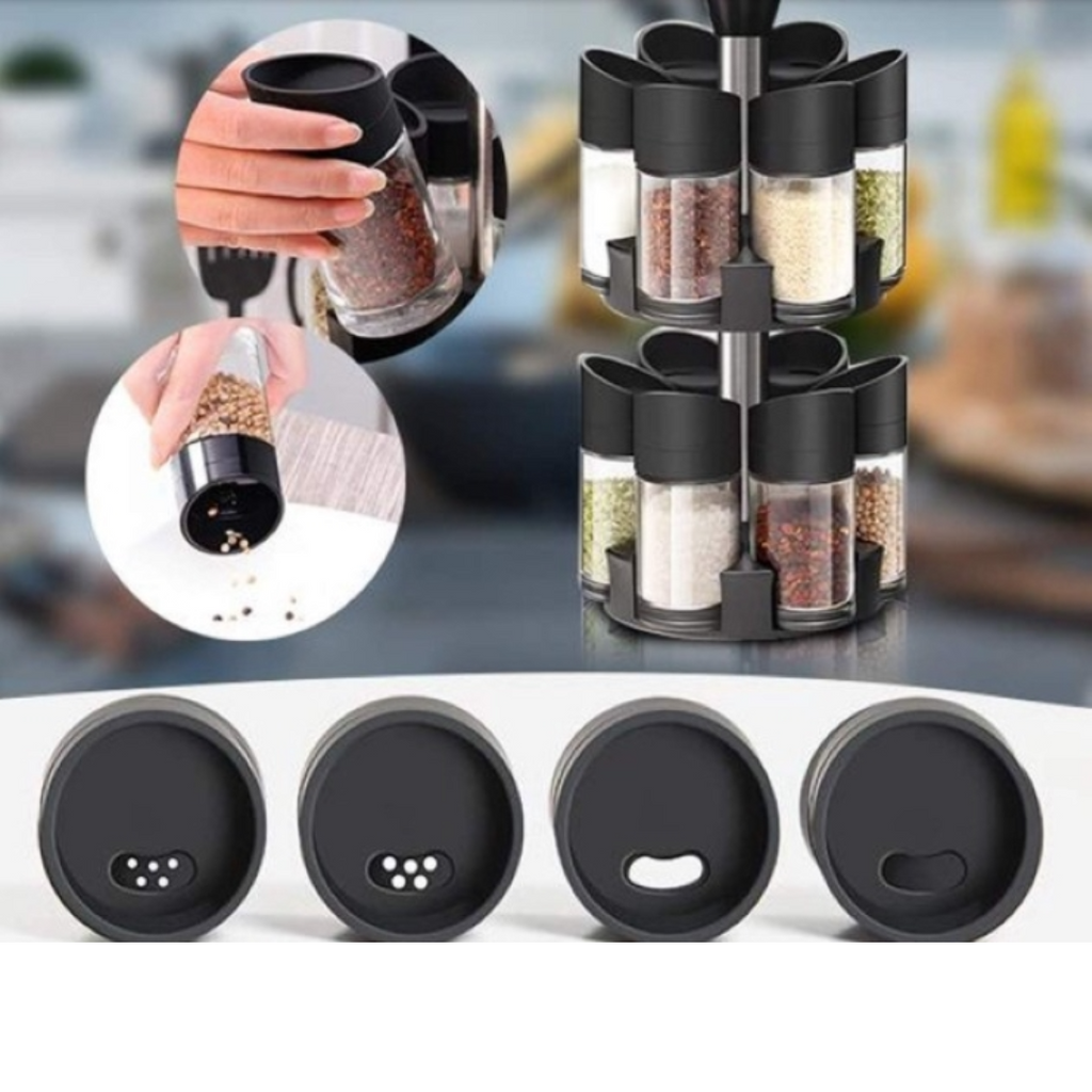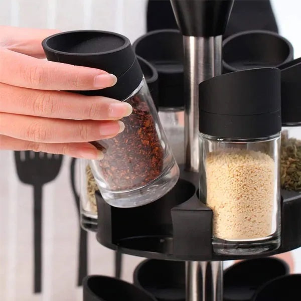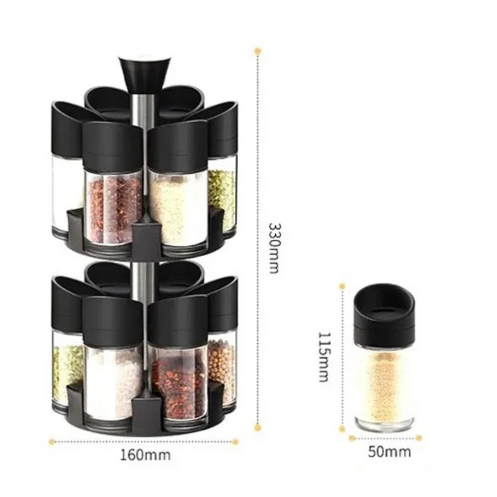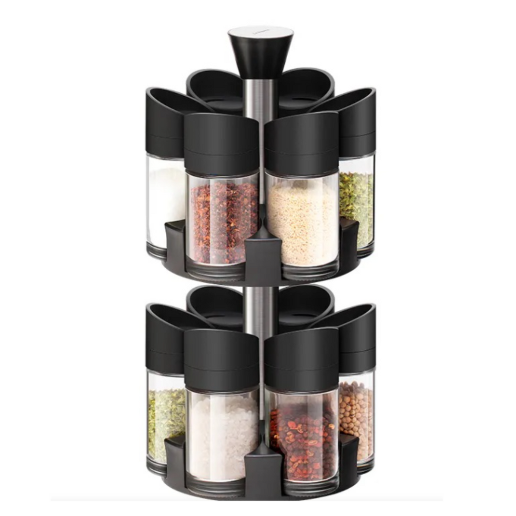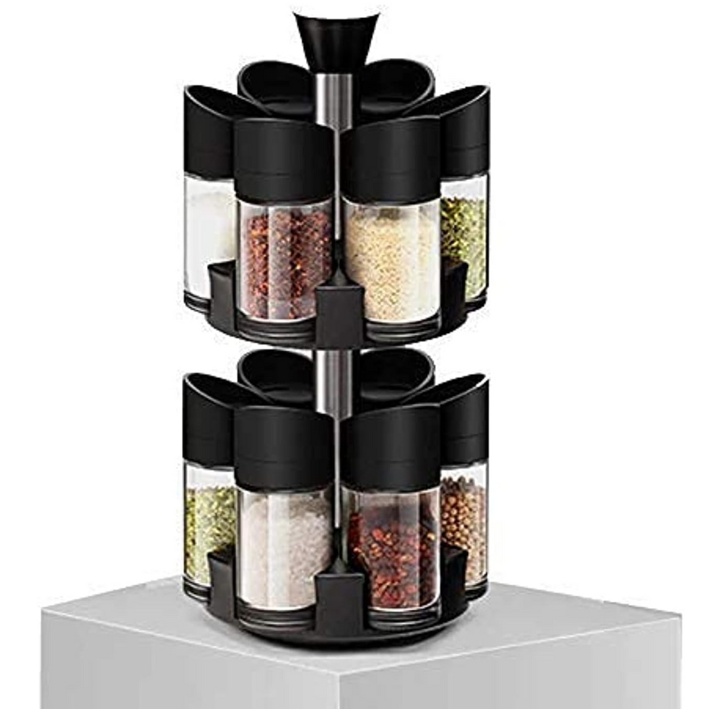 Set 12 Recipiente pentru Condimente , cu Suport Rotativ pe 2 Etaje, cu Maner, Negru