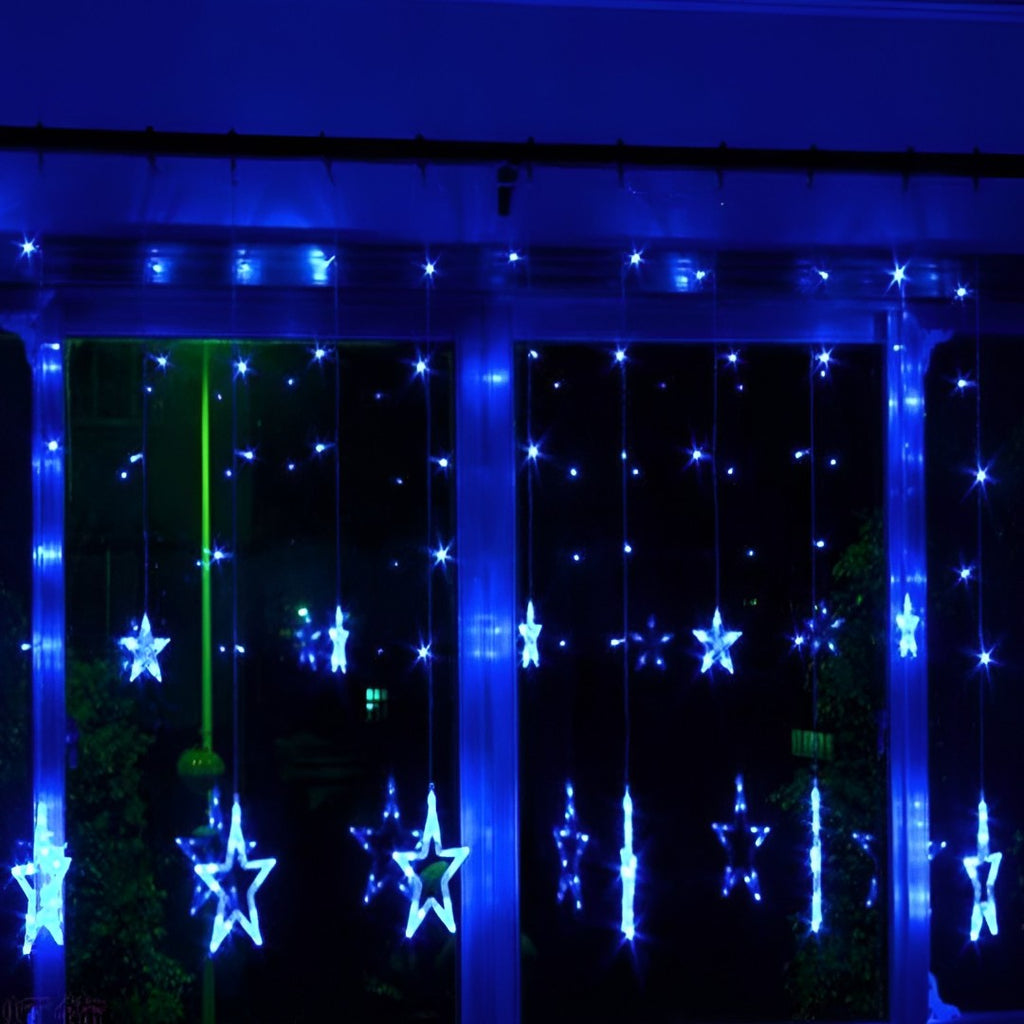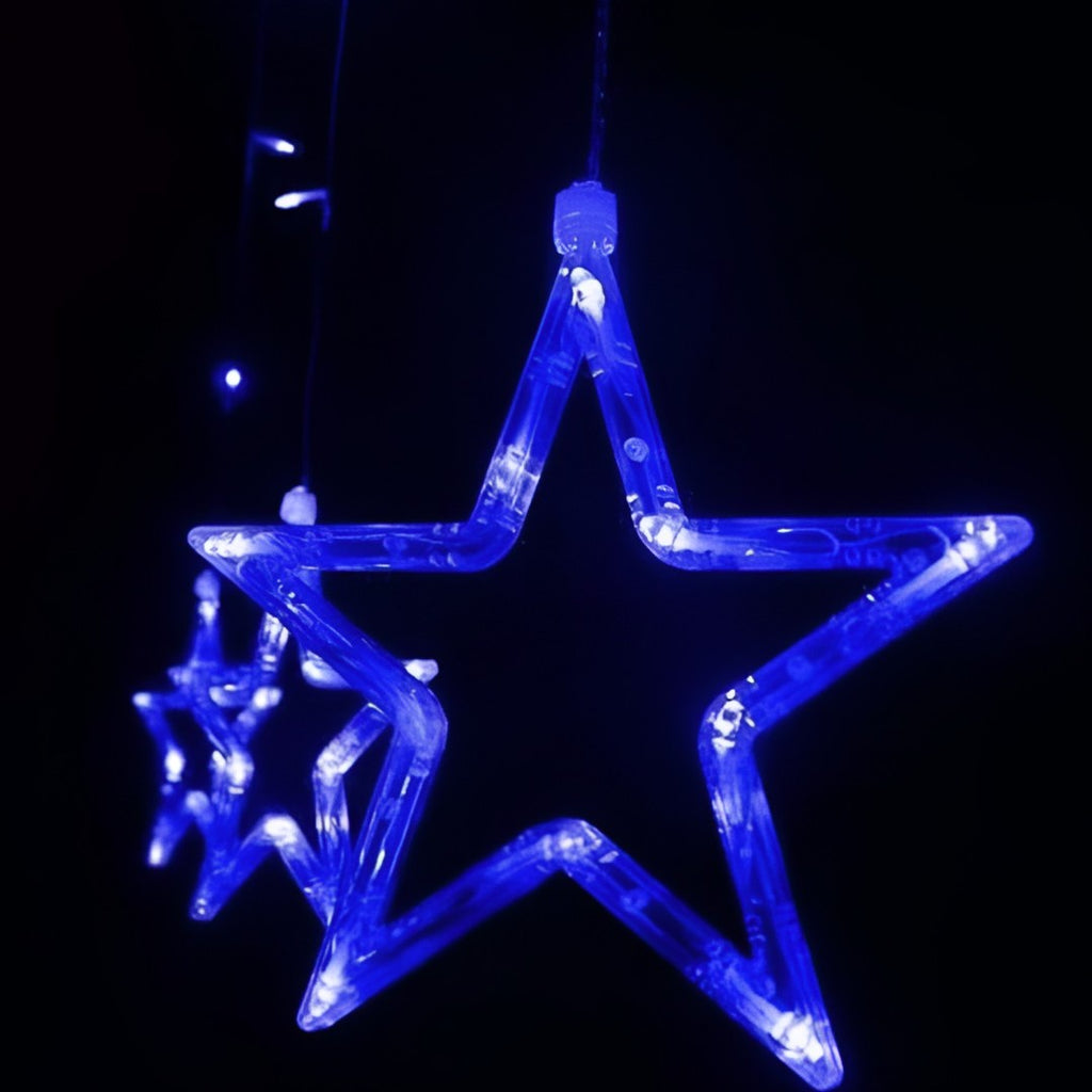Instalatie Ghirlanda Luminoasa de Craciun 12 Stele cu LEDuri Albastre cu franjuri inegali, interconectabilă cu stecher pentru instalatii similare, cu FIR INCOLOR.