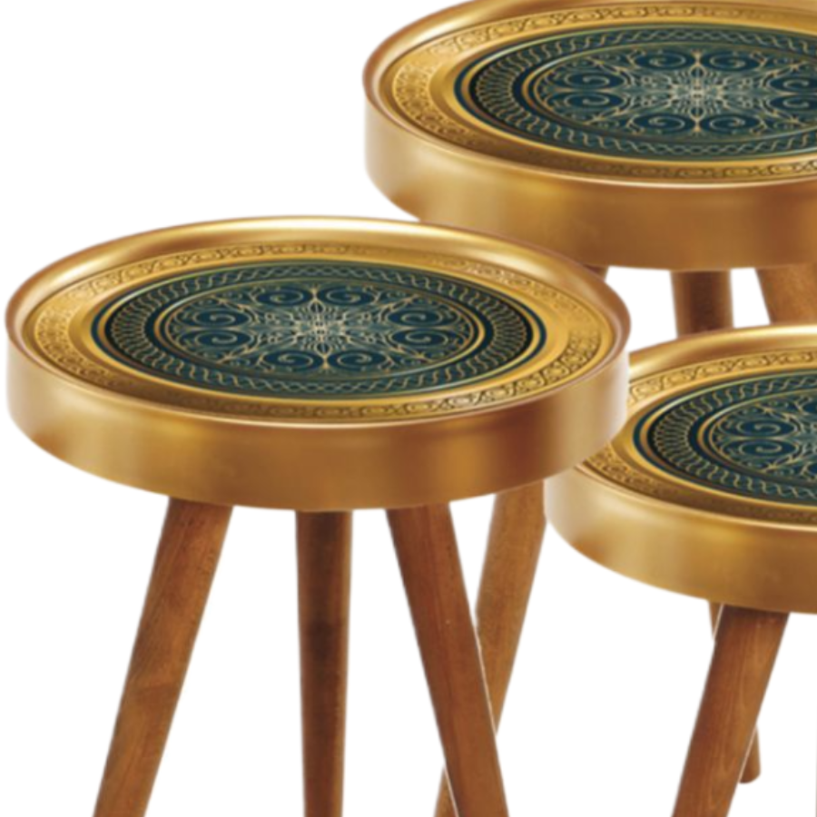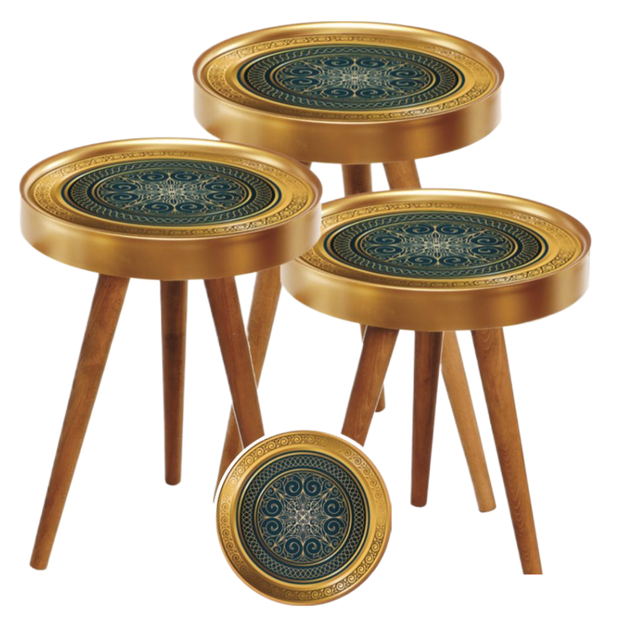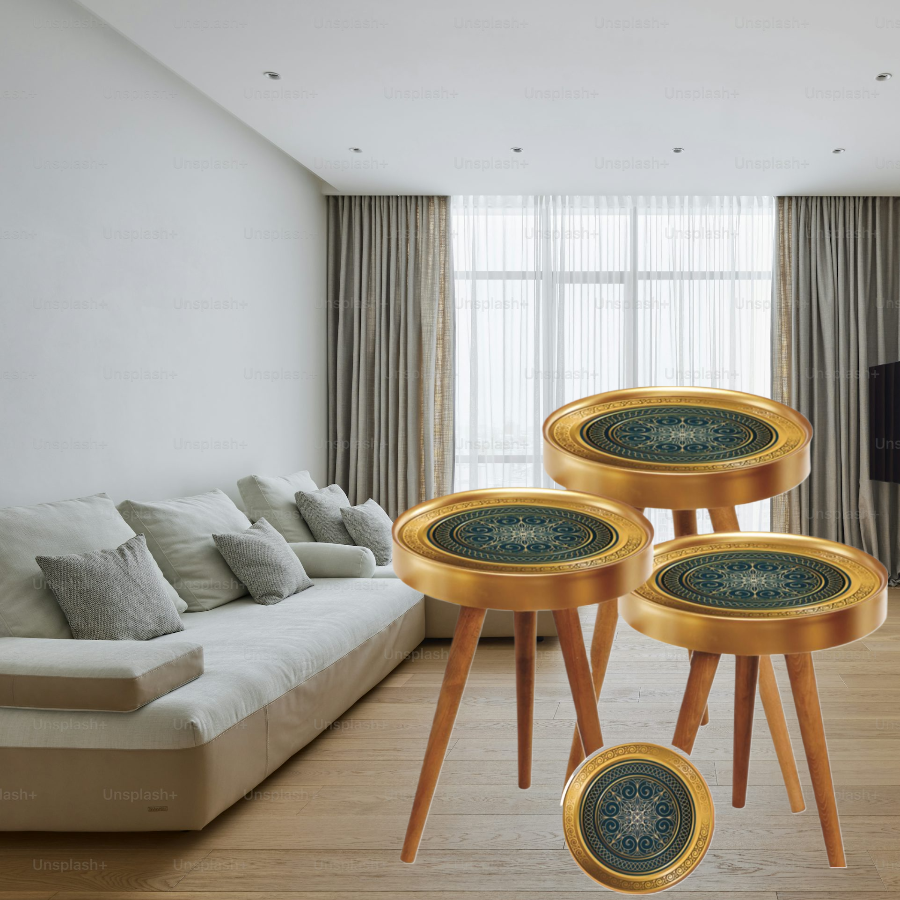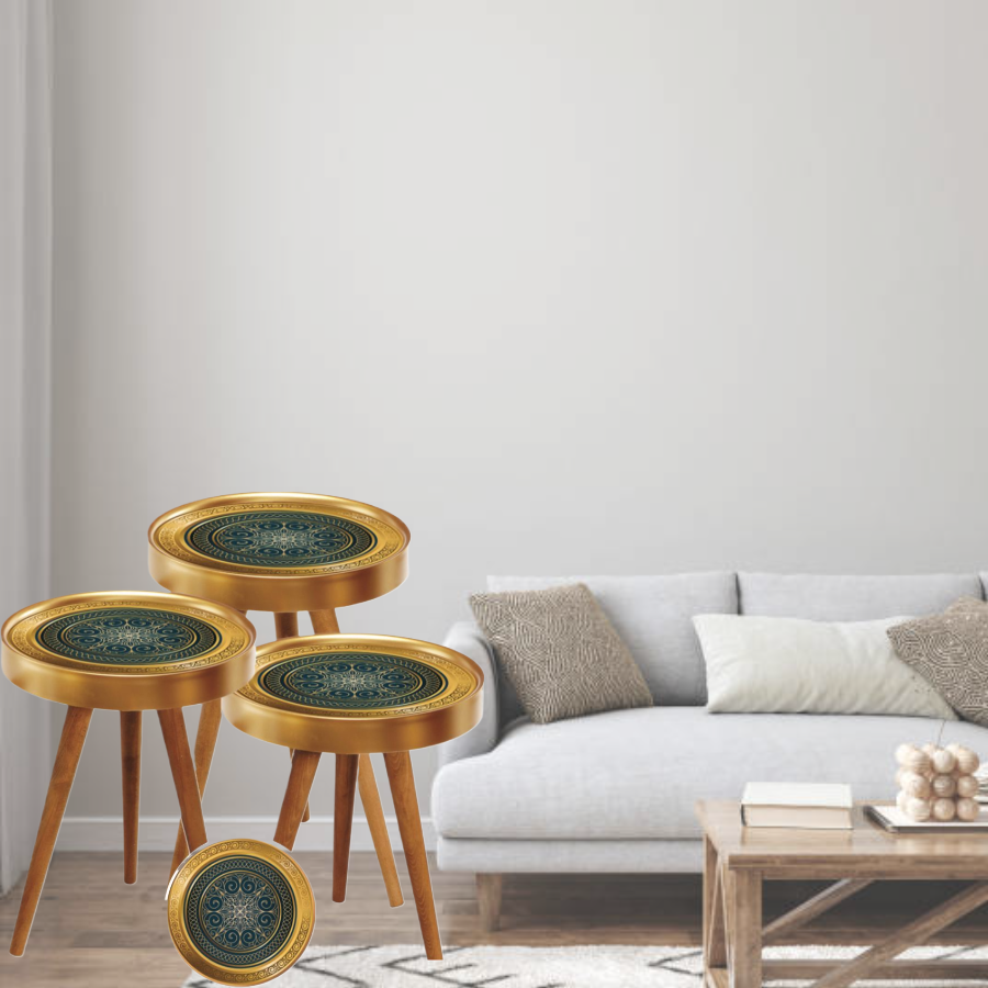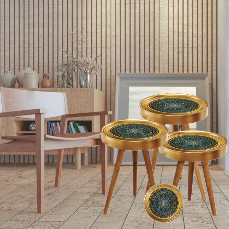 Set 3 Măsuțe Cafea Mărimi Diferite cu Blat Mandala Auriu cu Verde și Picioare din Lemn – Design Elegant și Luxos