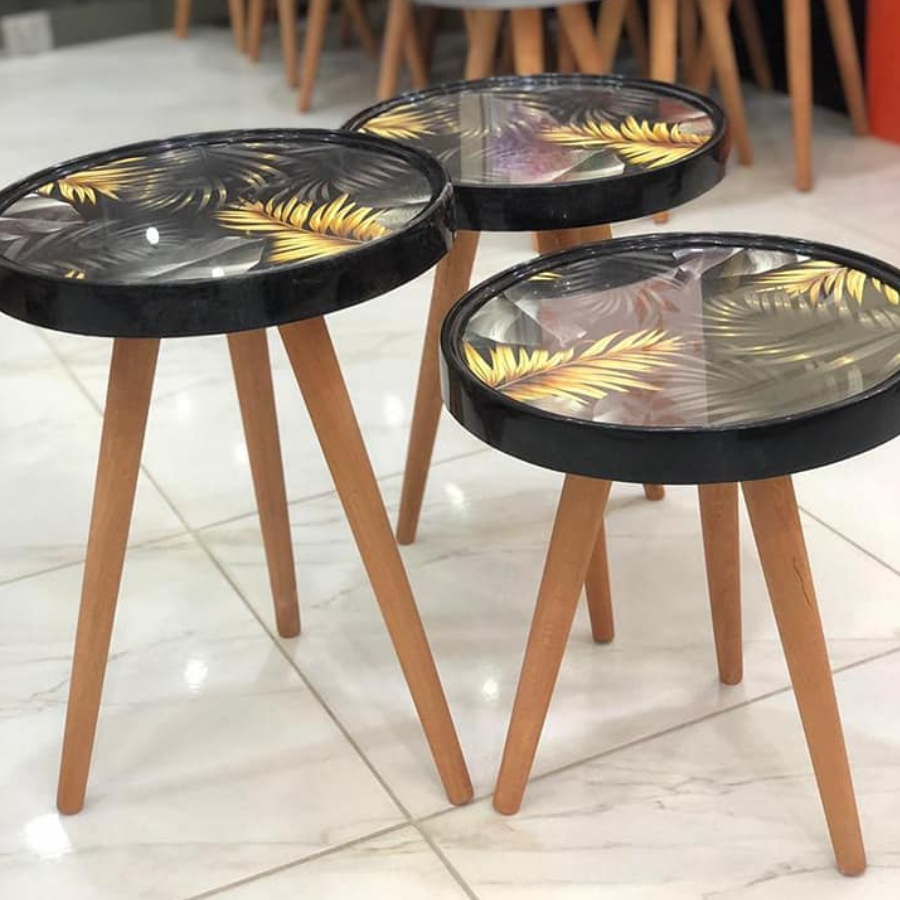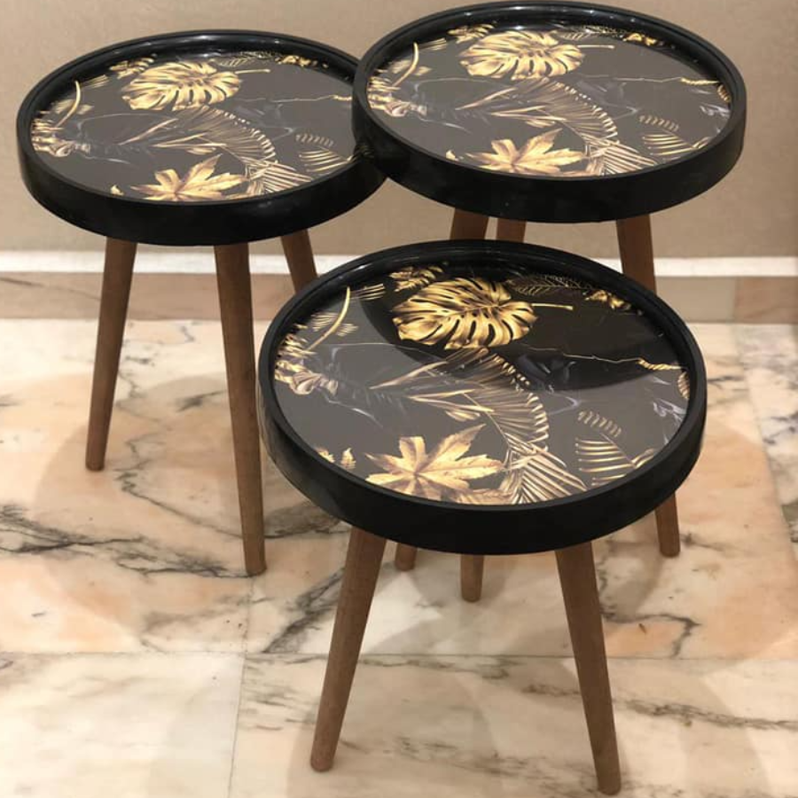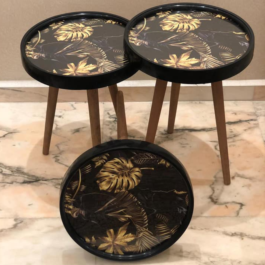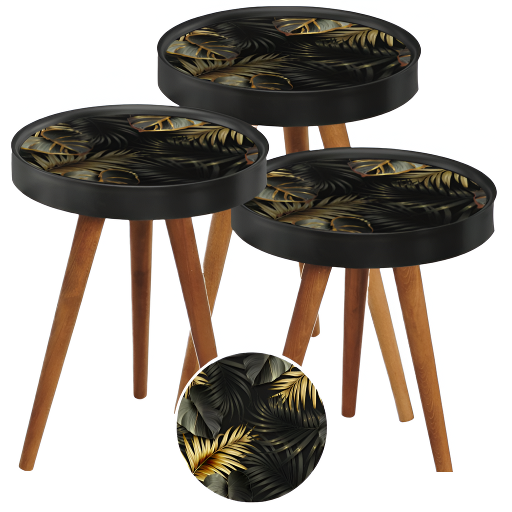 Adaugă un plus de stil și rafinament locuinței tale cu un set de 3 măsuțe de cafea ce combină eleganța și funcționalitatea. Blatul negru cu detalii aurii, inspirat de designul tropical, oferă un aer modern și sofisticat, potrivit pentru living, sufragerie, terasă acoperită sau spații de relaxare. Cele trei dimensiuni diferite permit folosirea lor împreună, într-un ansamblu armonios, sau separat, în funcție de nevoi.