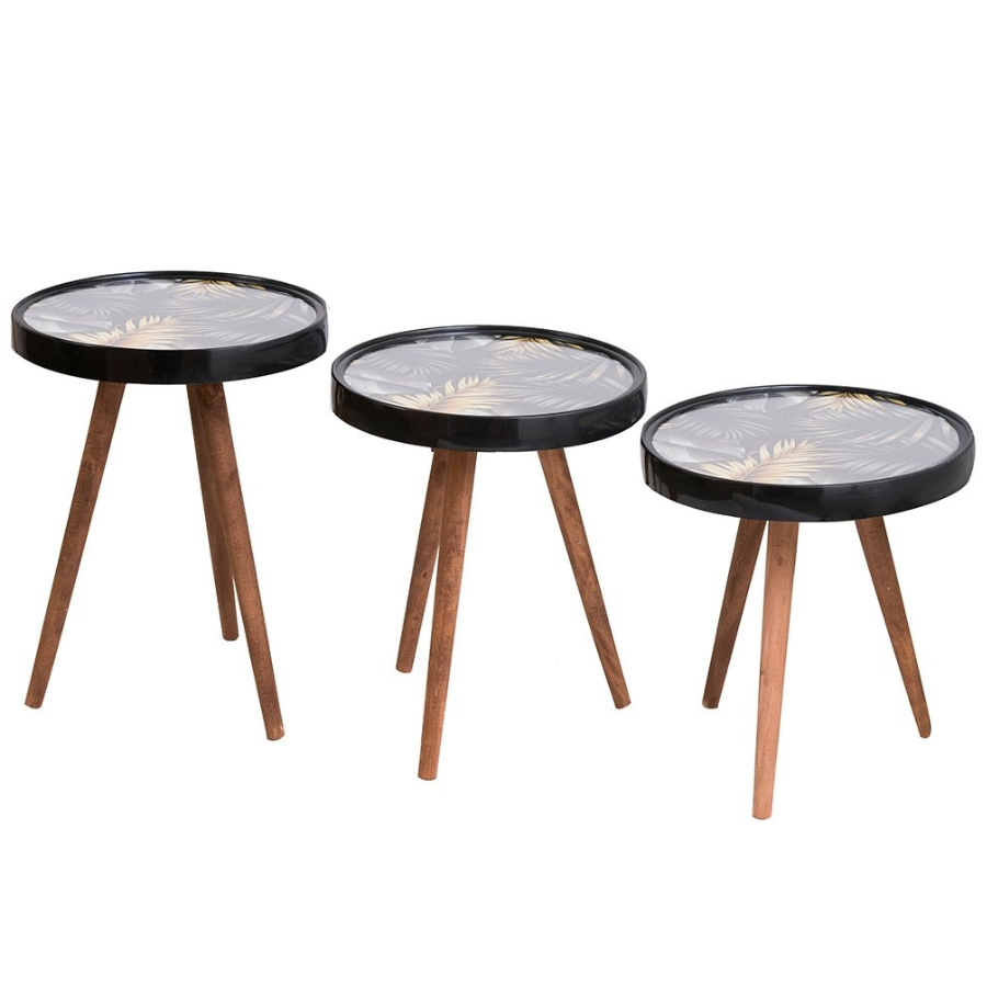Set 3 Măsuțe Cafea – Mărimi Diferite, Design Tropical, Blat Negru cu Auriu, Picioare Lemn Natural, Stil Elegant și Modern