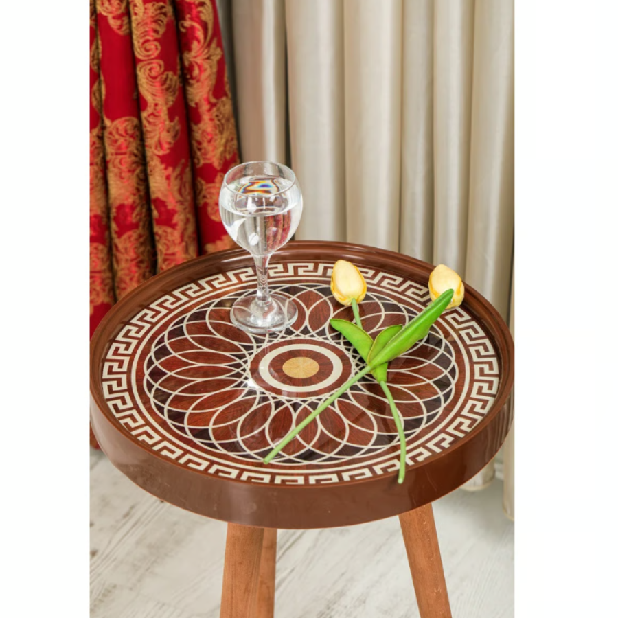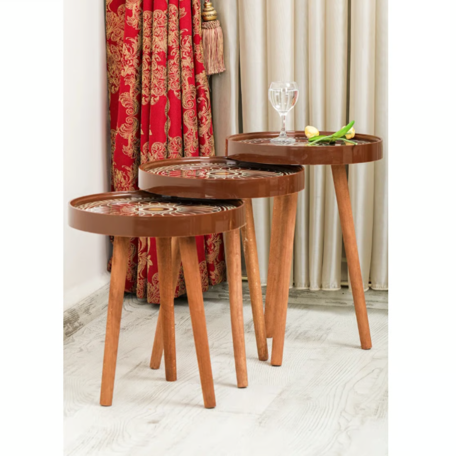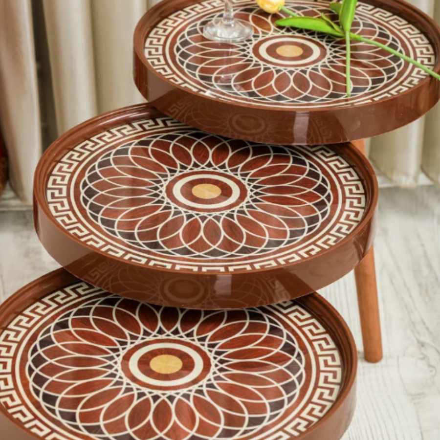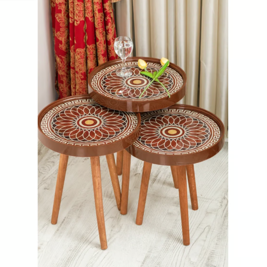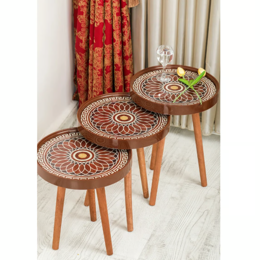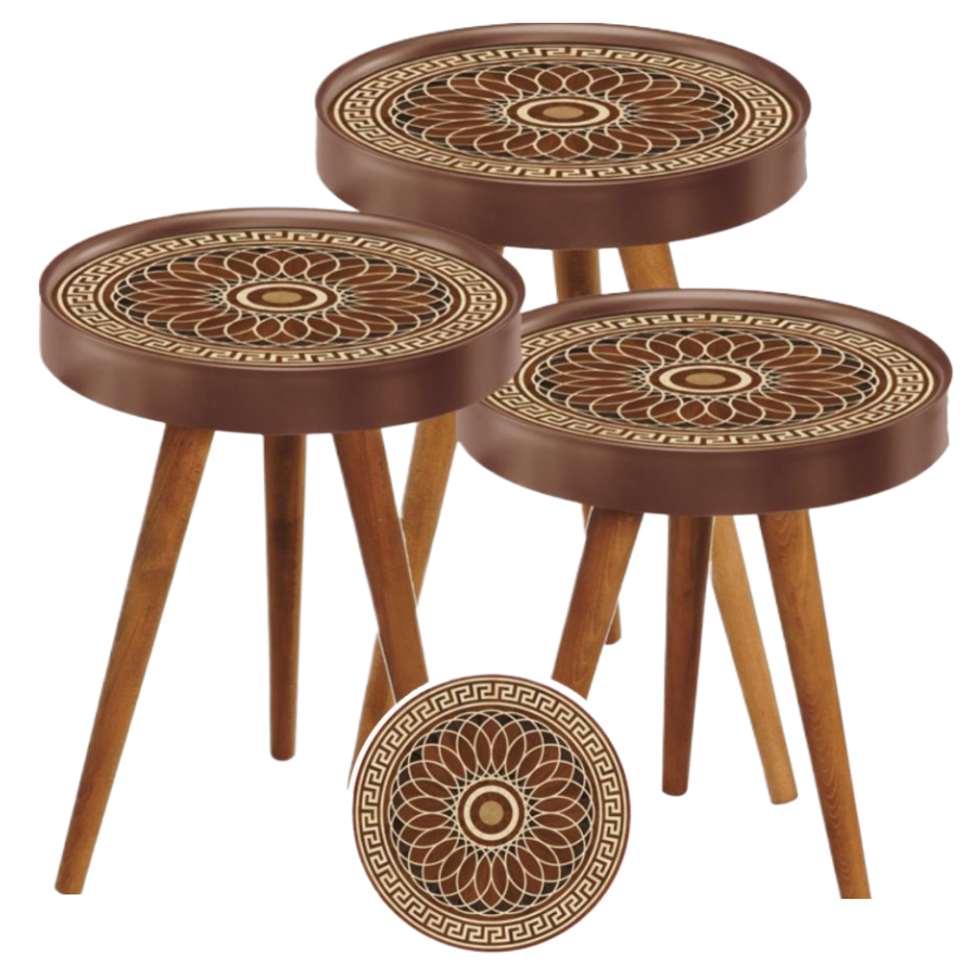 Acest Set 3 Măsuțe Cafea Maro cu Motive Florale și Geometrice, Accent Grecesc este alegerea ideală pentru cei care își doresc un decor sofisticat, elegant și funcțional, adăugând un plus de stil și căldură în orice încăpere.