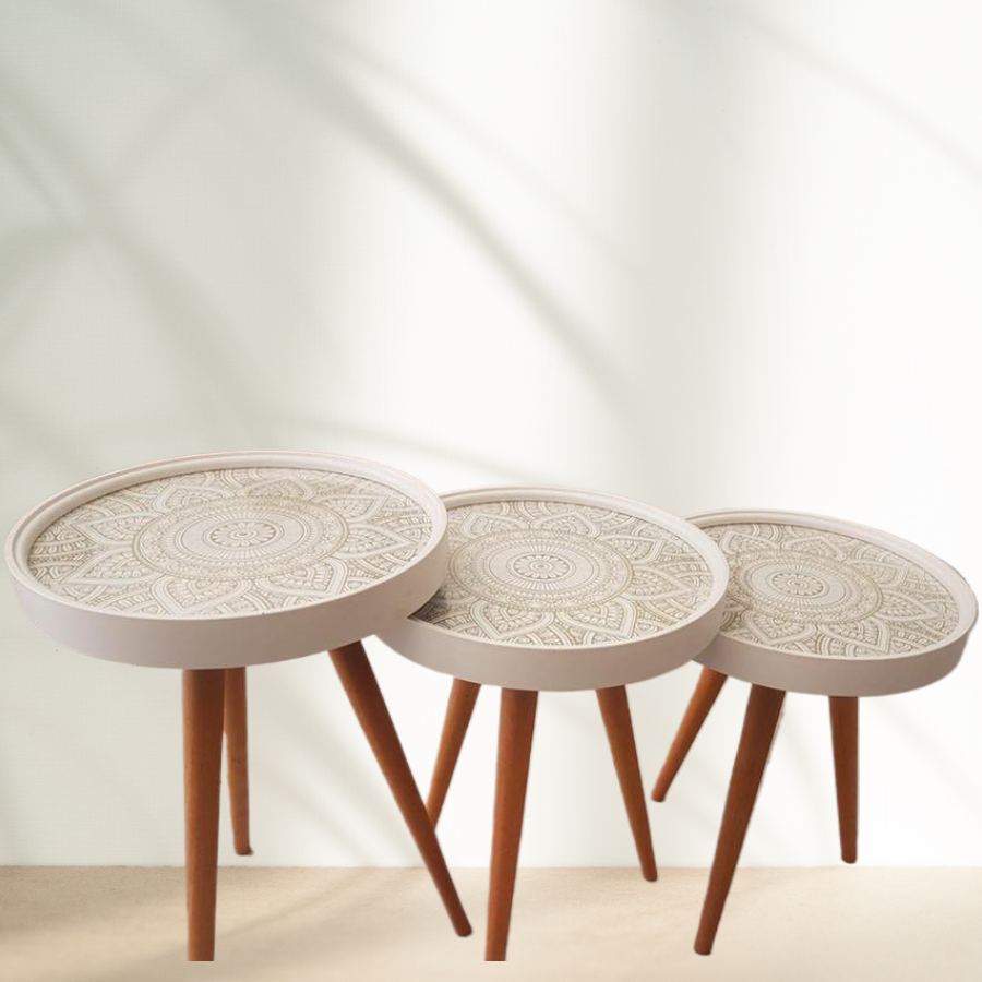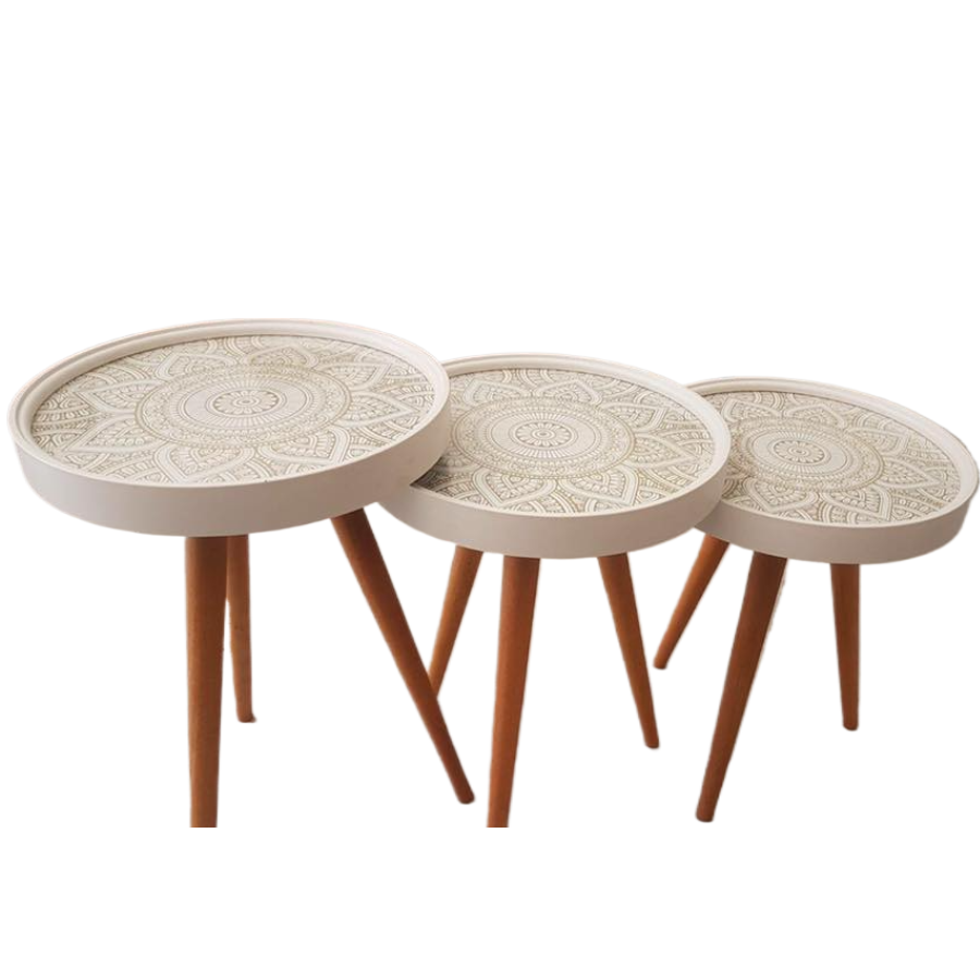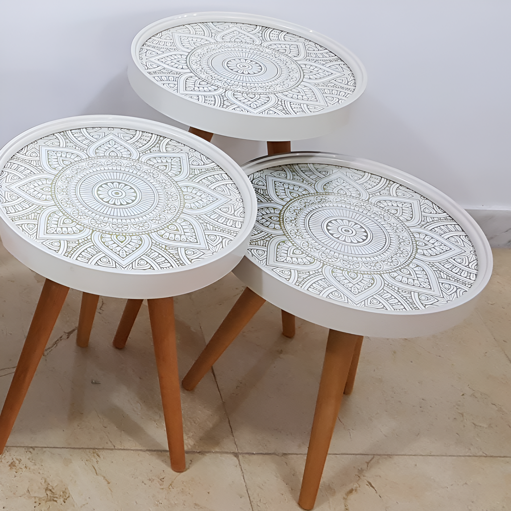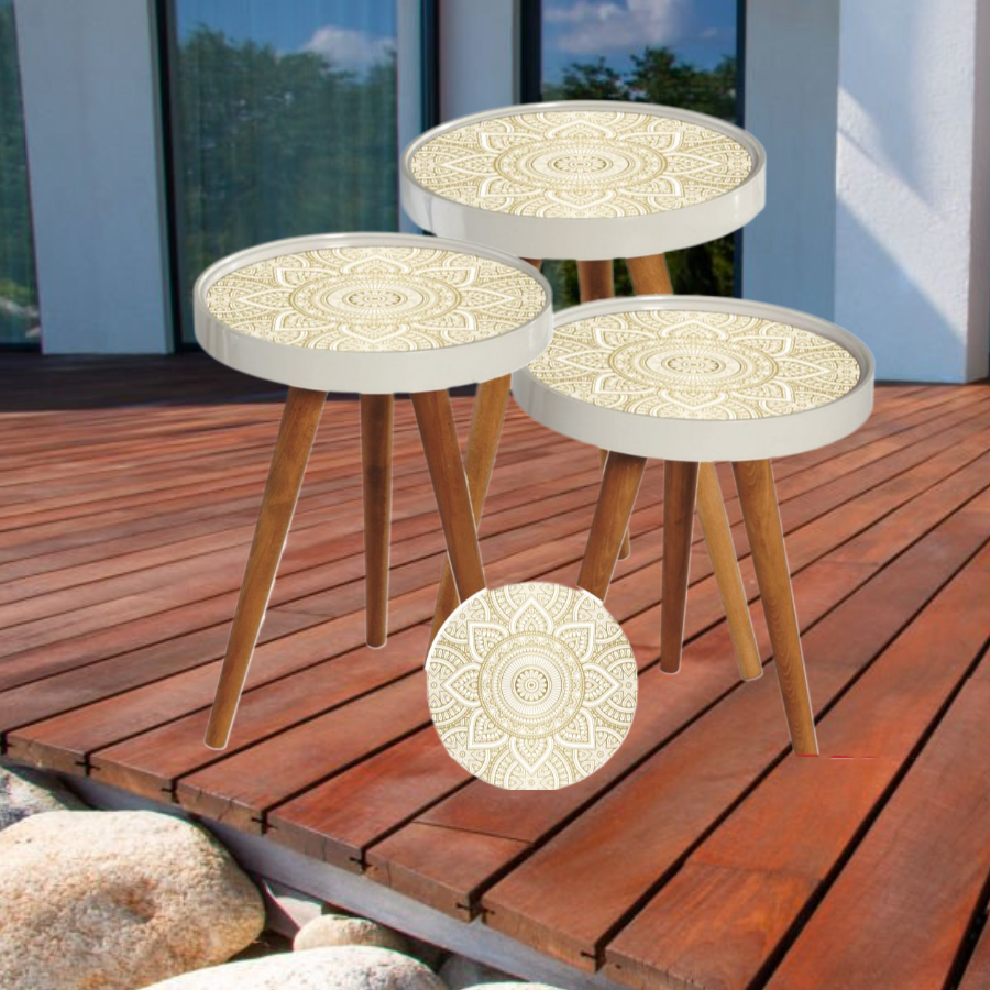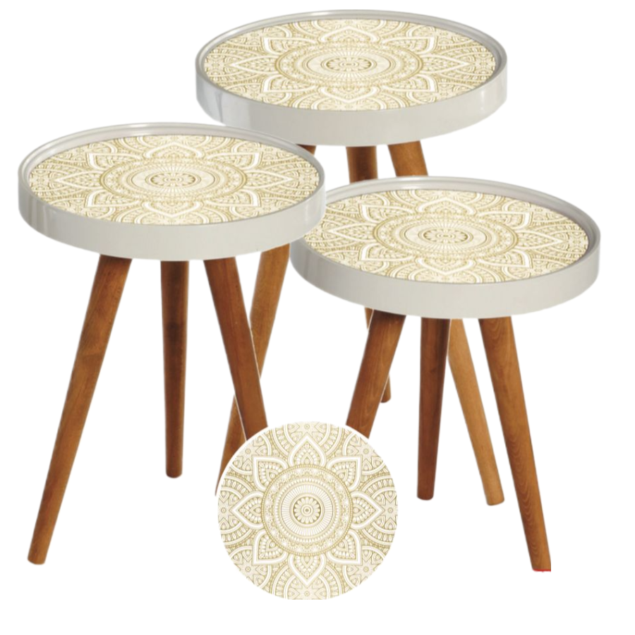Adauga un plus de stil si functionalitate casei tale cu acest set de 3 masute decorative rotunde. Cu blat alb decorat cu model mandala auriu si picioare din lemn natural, aceste masute sunt perfecte pentru living, dormitor sau balcon. Designul elegant si modern le transforma intr-un adevarat punct focal, in timp ce functionalitatea lor versatila iti permite sa le folosesti ca masute de cafea, suport pentru plante, noptiera sau element decorativ.