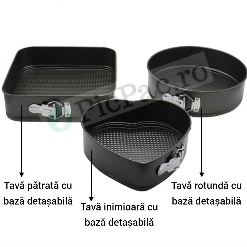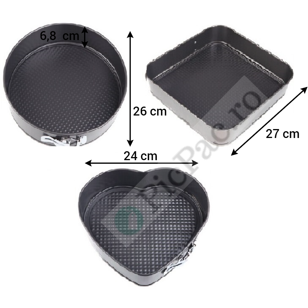 - Reprezinta un cadou care isi gaseste utilitatea in orice bucatarie, fie privata sau de restaurant. - Prajiturile dumneavoastra, simple sau cu 3 etaje, vor fi spectaculoase si delicioase daca vor fi coapte in aceste tavi. - Baza tavilor este detasabila, prin deschiderea peretilor laterali. - Tortul sau prajitura dumneavoastra isi va pastra forma initiala. - Aceste tavi pot fi folosite pentru desertul familiei sau pentru realizarea torturilor la diferite evenimente ca: nunta, botez, Craciun, Paste, Valentine's Day, Dragobete, ziua de nastere a persoanei iubite s.a.m.d.