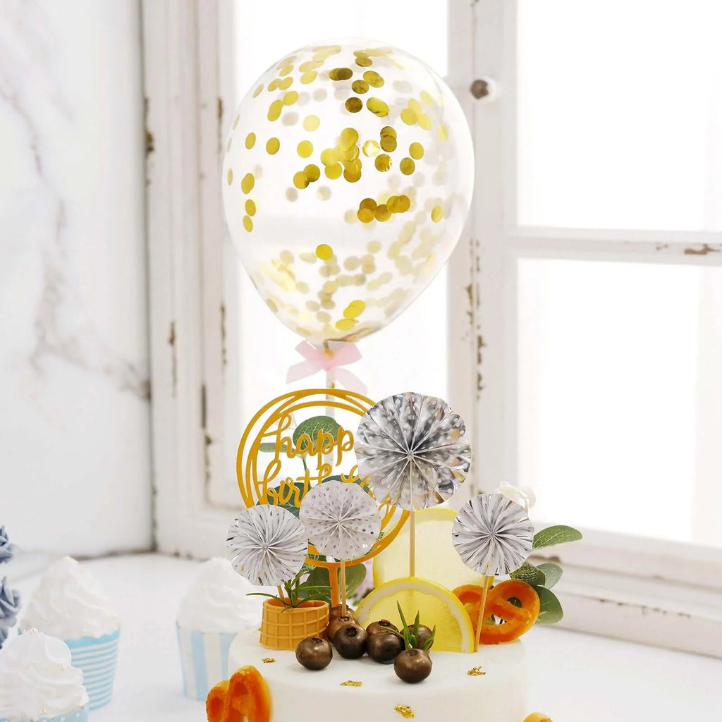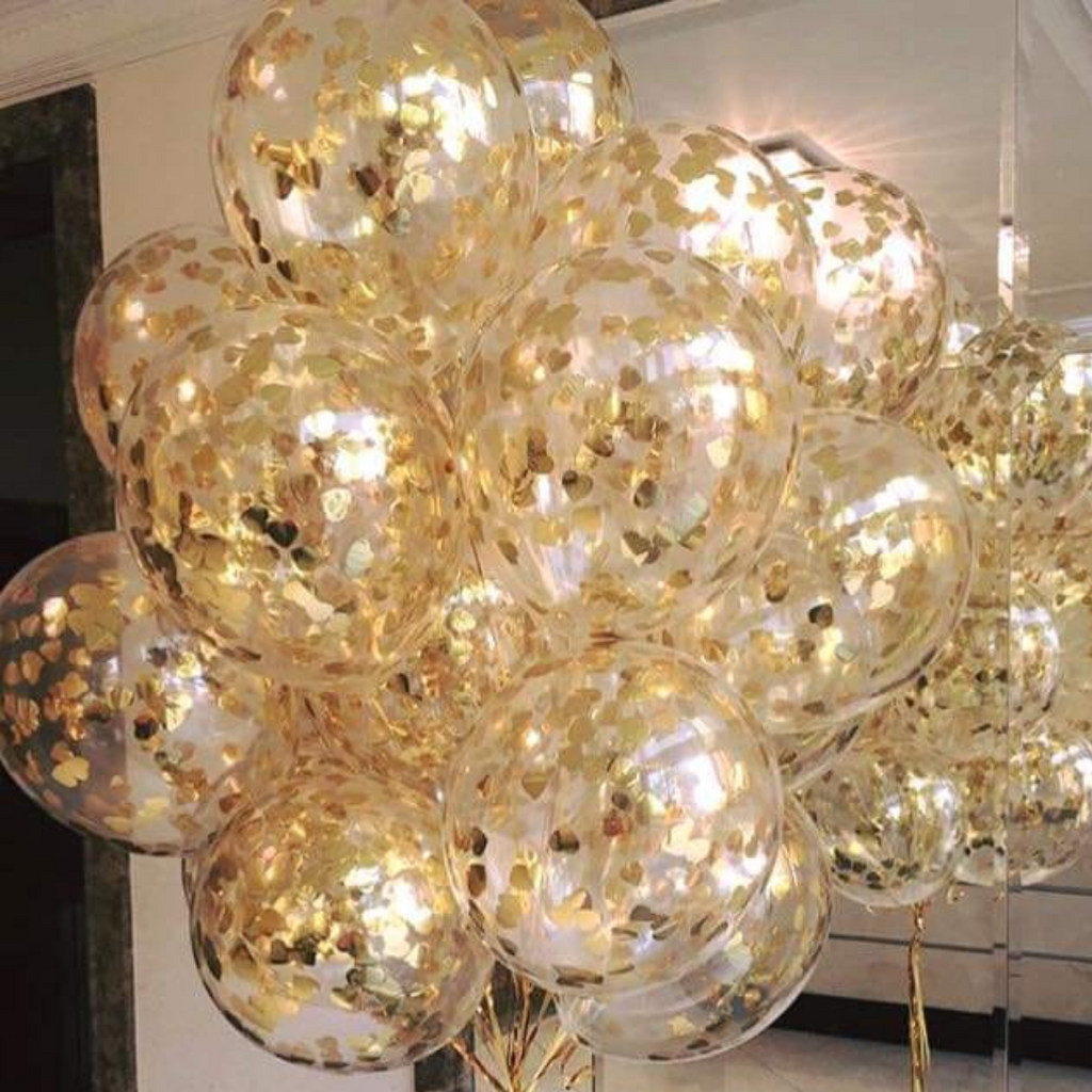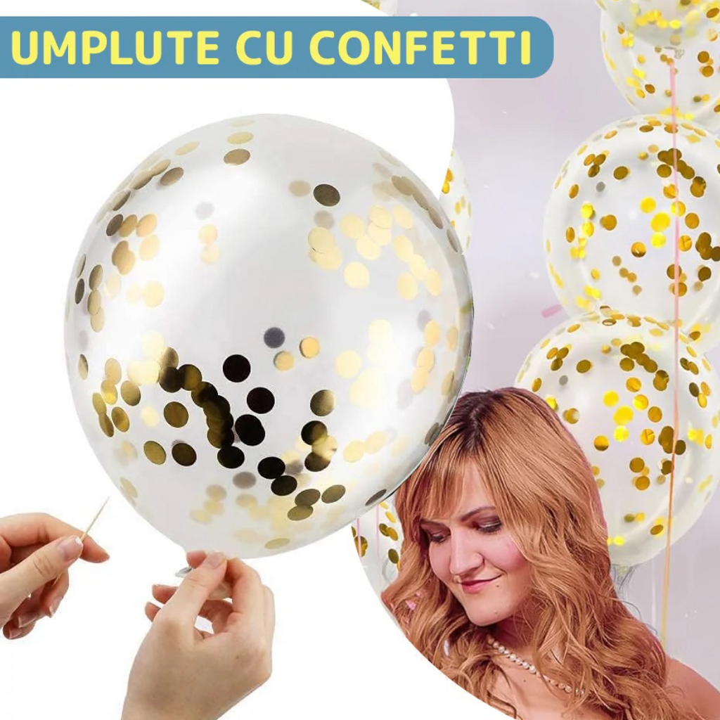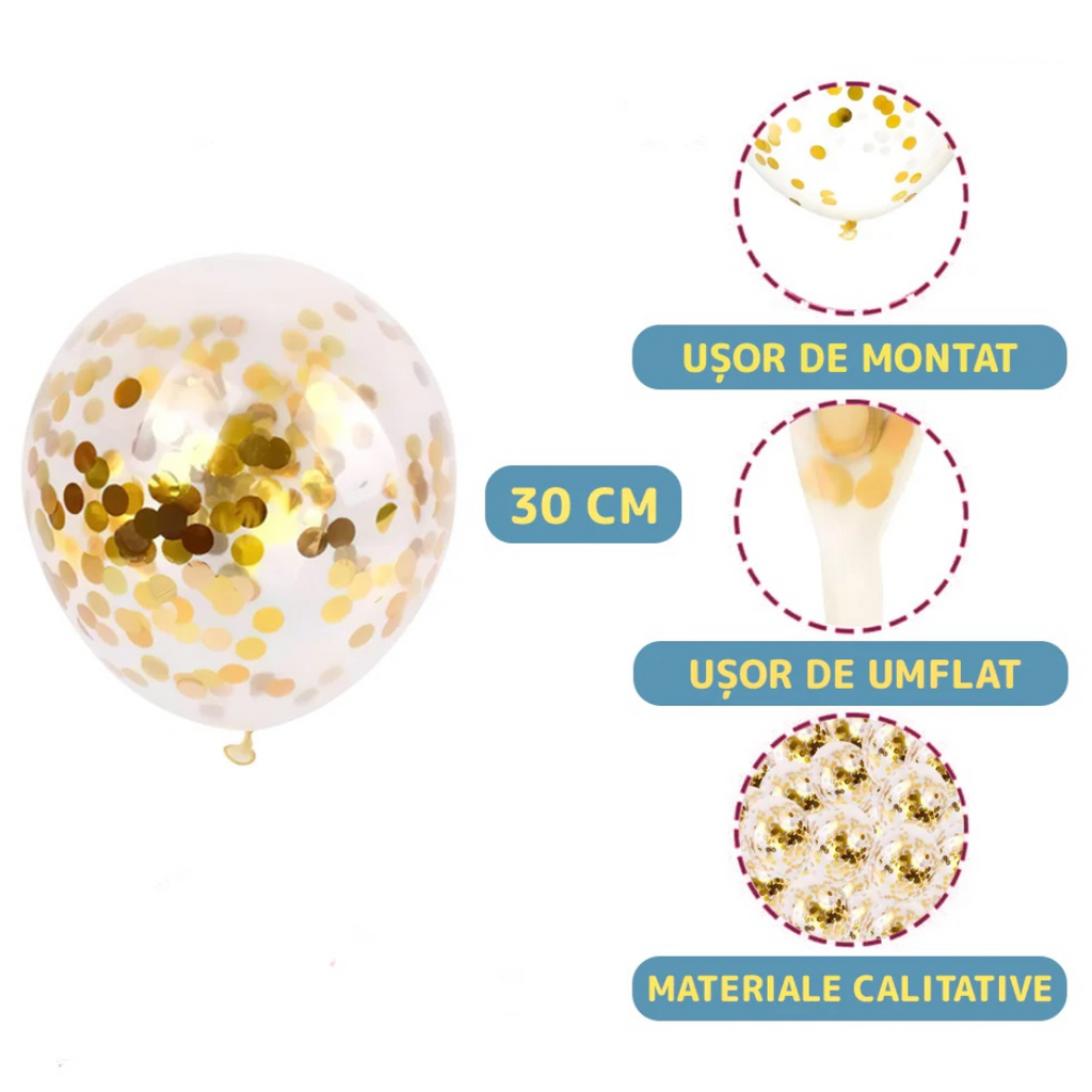 Creează o atmosferă sofisticată și festivă cu aceste baloane transparente cu confetti aurii, perfecte pentru momente speciale