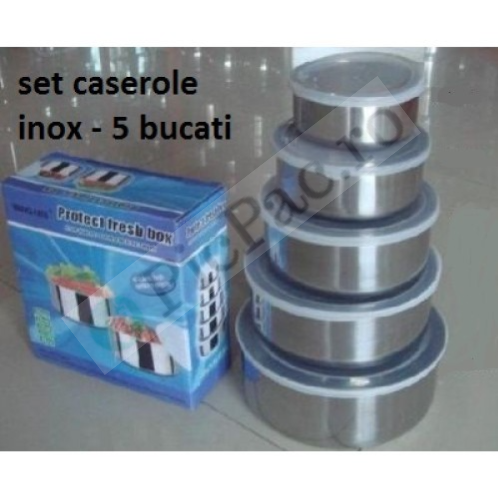 Setul contine 5 caserole metalice, de marimi diferite, cu diametru cuprins intre: 10,12,14,16 si 18 cm