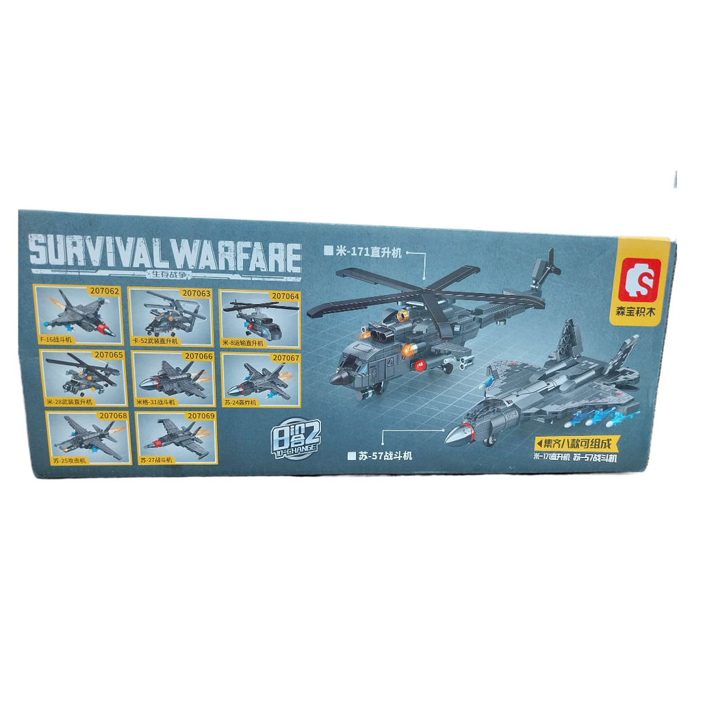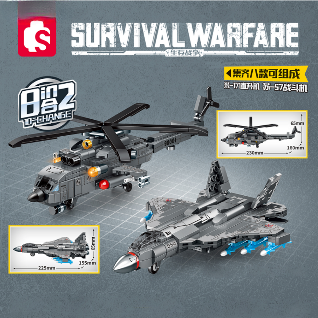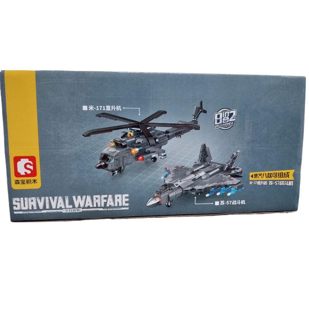 Setul de construcții 8 în 2 pentru supraviețuire în luptă cu un elicopter militar si avion este o alegere captivantă pentru cei pasionați de aventuri și acțiune. Acest set oferă posibilitatea de a construi diferite modele de elicoptere militare și accesorii pentru situații de supraviețuire și luptă.
