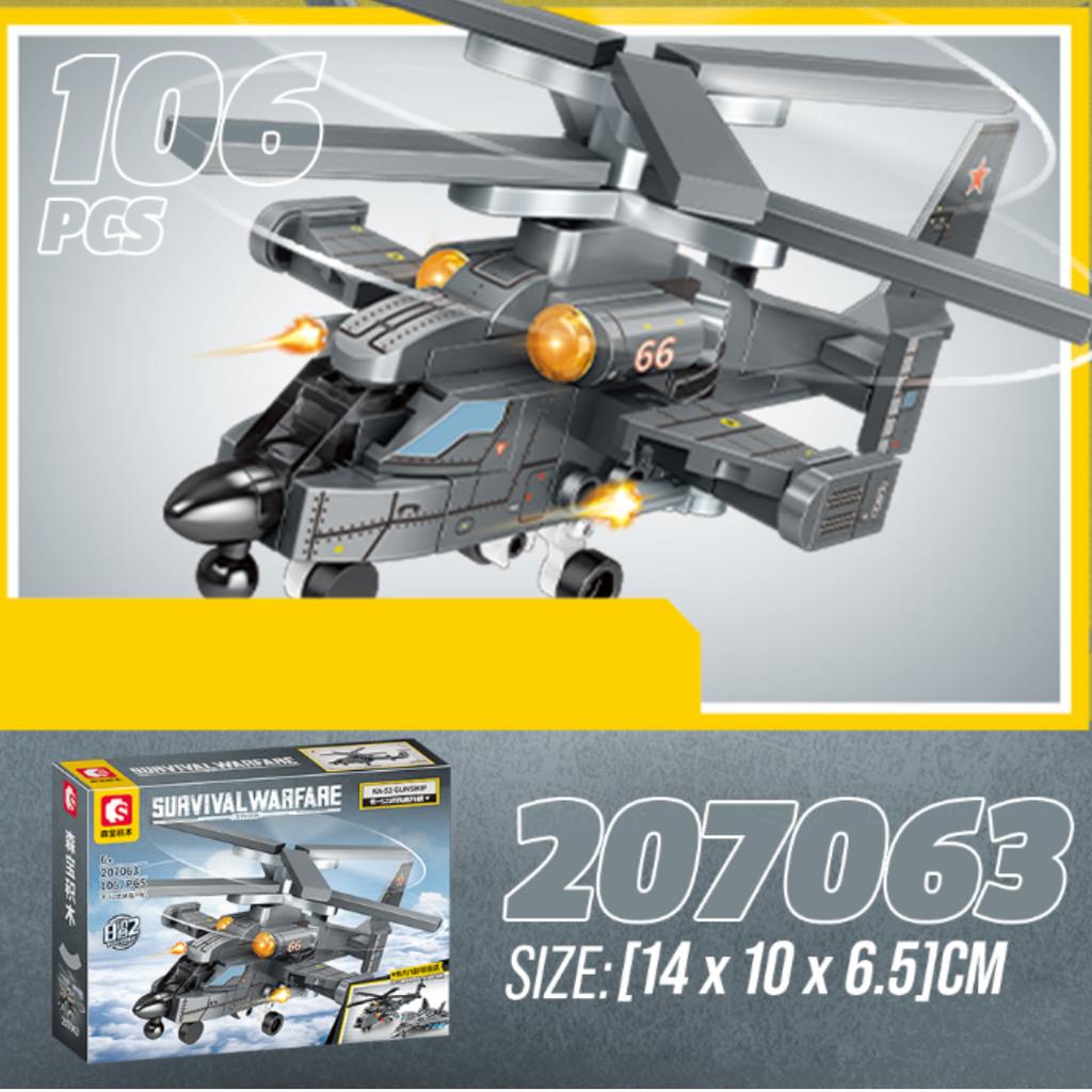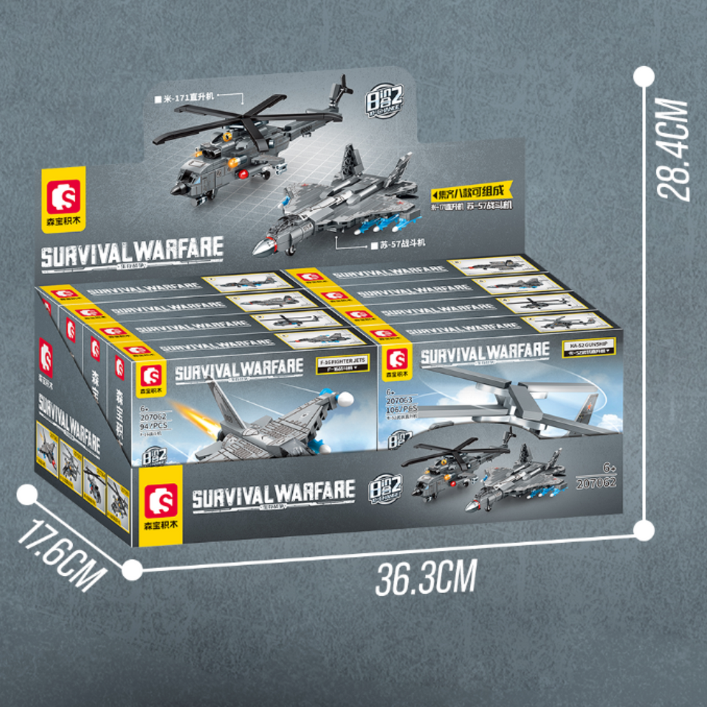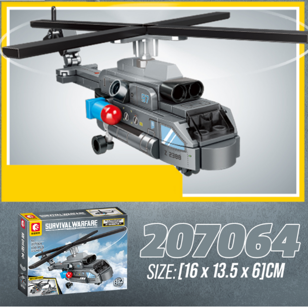 Setul de construcții 8 în 2 pentru supraviețuire în luptă cu un elicopter militar si avion este o alegere captivantă pentru cei pasionați de aventuri și acțiune. Acest set oferă posibilitatea de a construi diferite modele de elicoptere militare și accesorii pentru situații de supraviețuire și luptă.