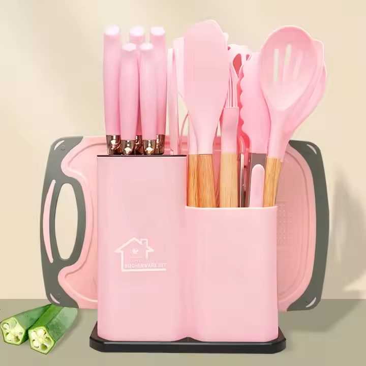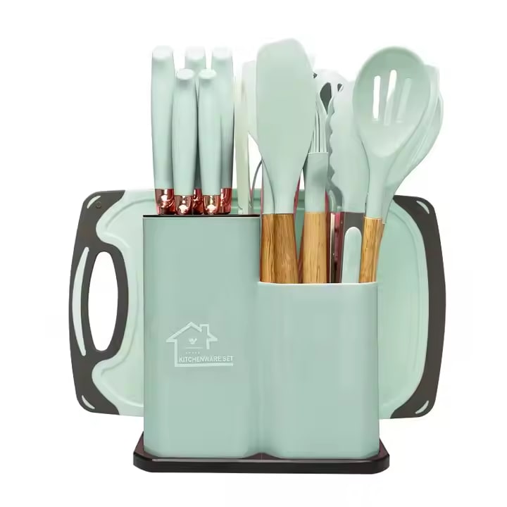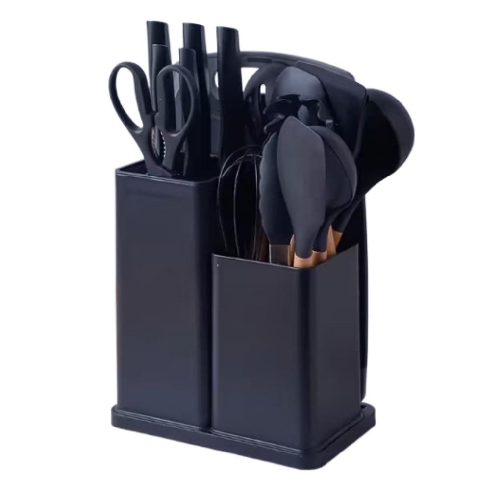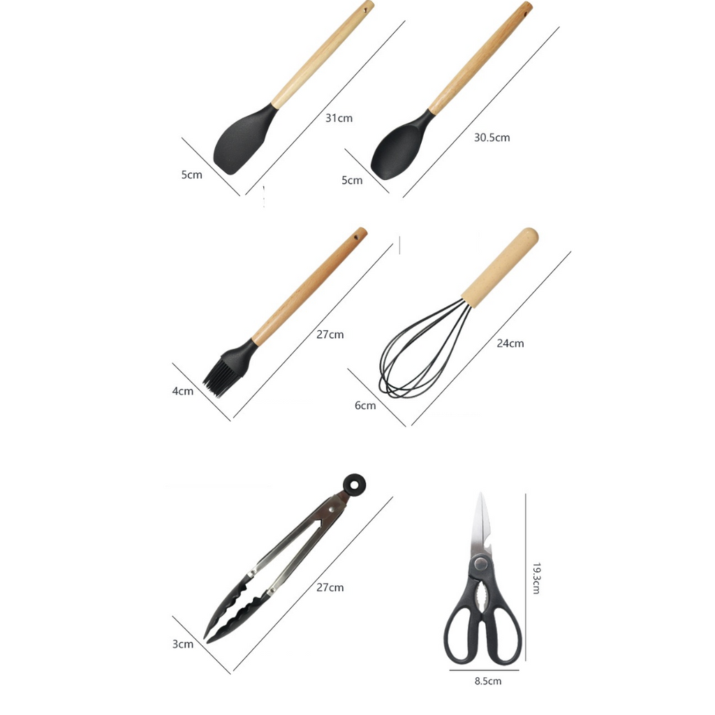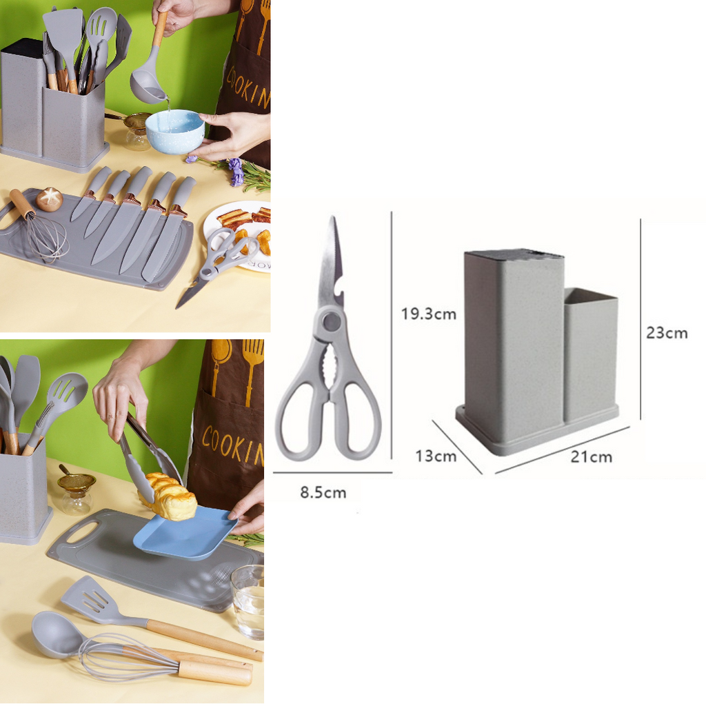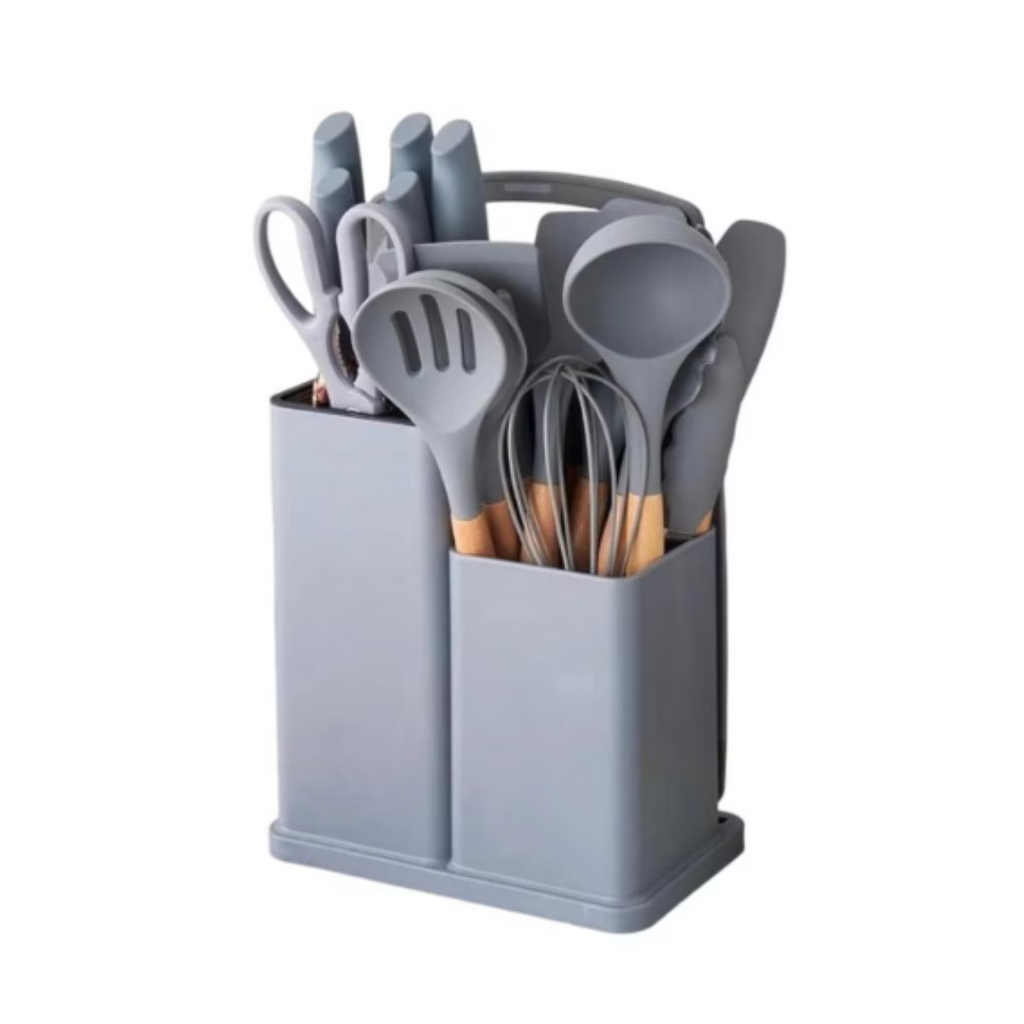 Set de 19 Ustensile de Bucătărie din Silicon cu Suport și Mânere din Lemn – Funcționalitate și Eleganță în Bucătăria Ta