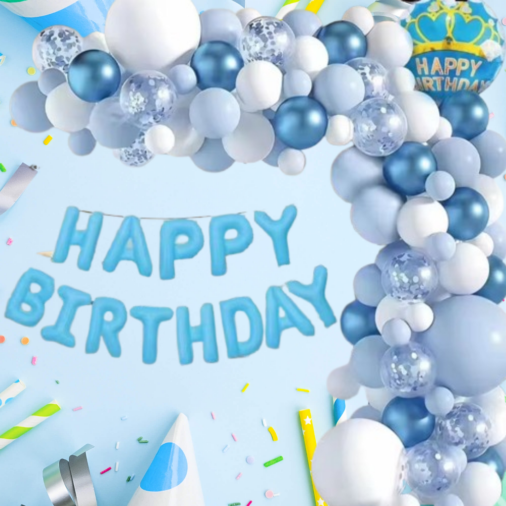 Set Decor Party – Arc Ghirlandă cu 83 Baloane Alb & Albastru + Banner „Happy Birthday”