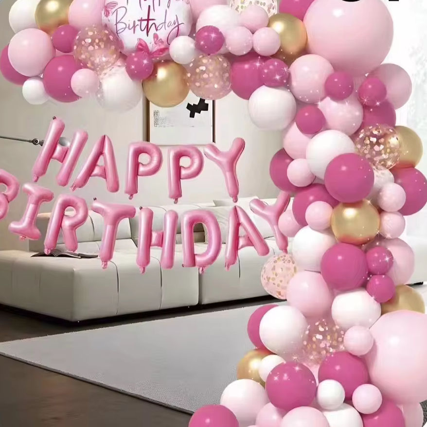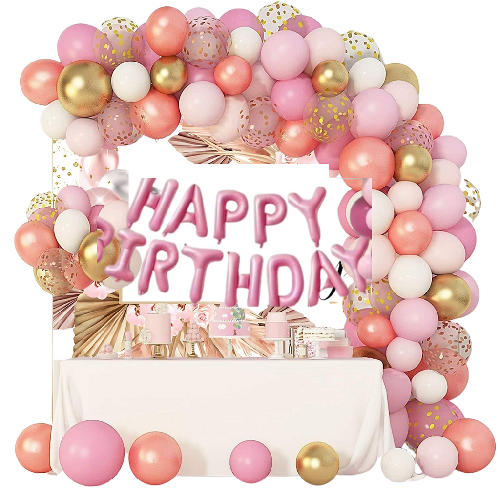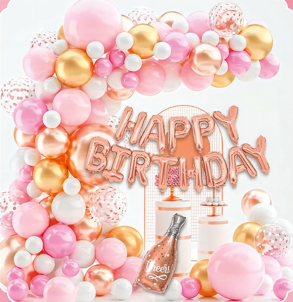 Set Decor Party – Arc Ghirlandă cu 83 Baloane Roz, Auriu, Alb + Banner "Happy Birthday"