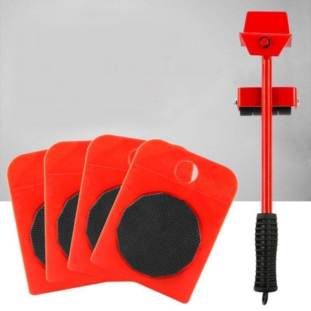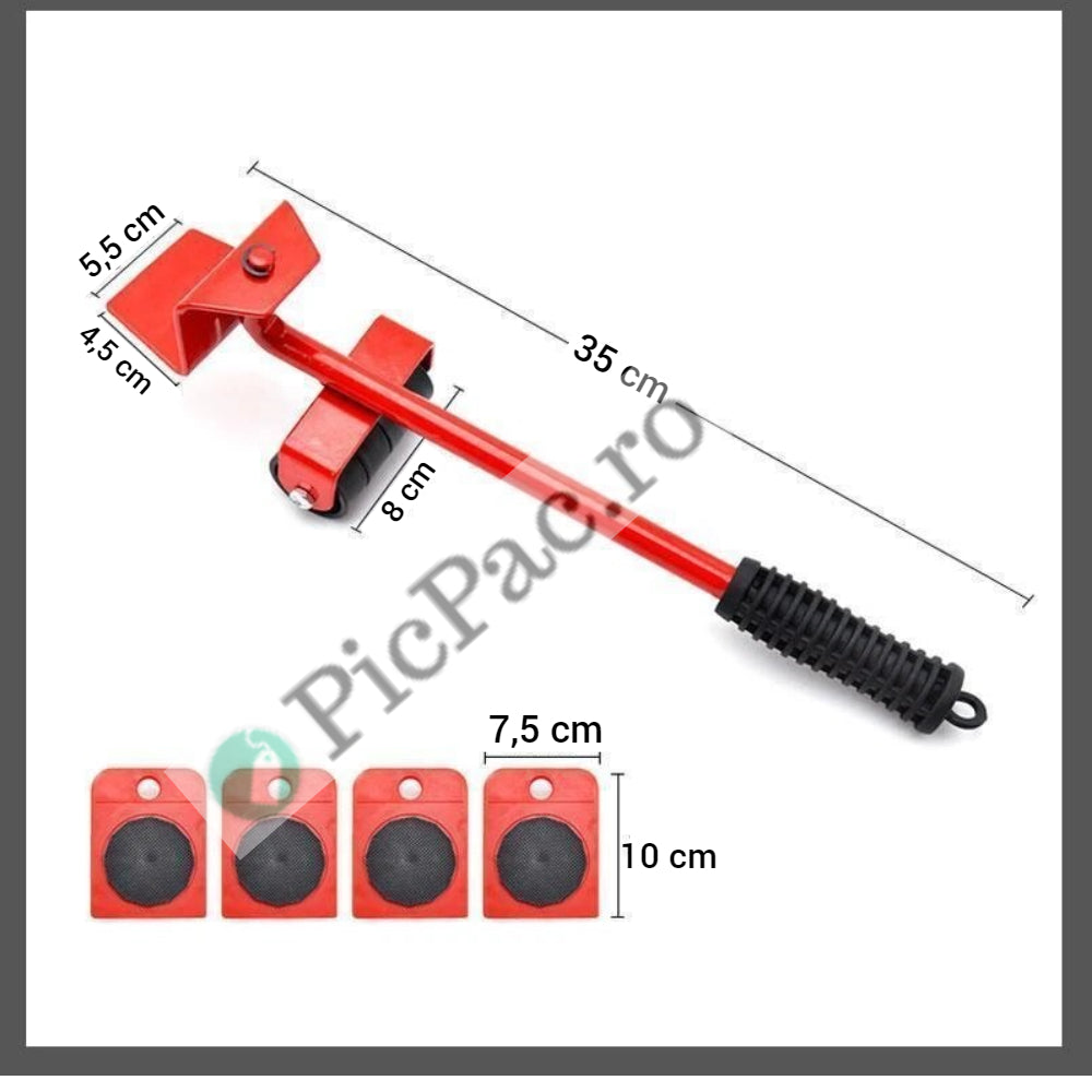 Acest set pentru mutat mobila grea este format din 4 piese cu roti si o parghie cu roti.