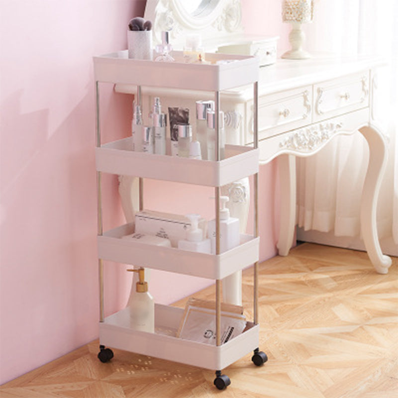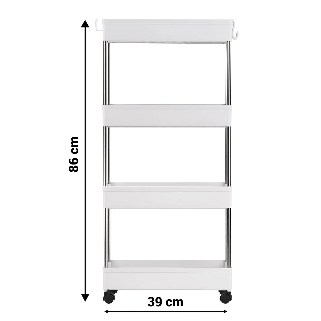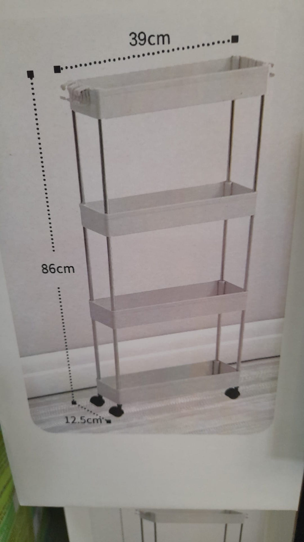 Material: - Polipropilena - Plastic rezistent - Cauciuc (roti) Culoare: alb 4 rafturi Dimensiuni: 39 cm latime si 86 cm inaltime