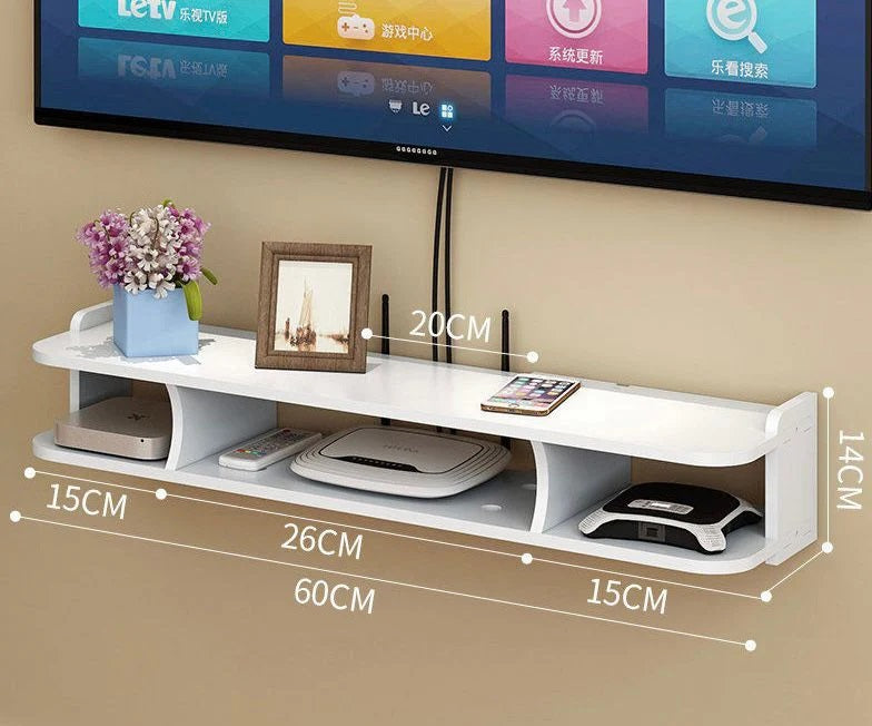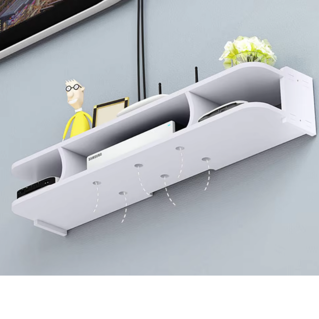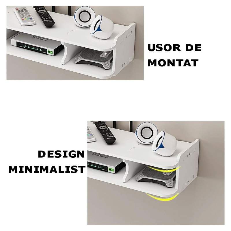 Suportul se poate vopsi in functie de preferinte si are dimensiuni compacte de 60 cm x 20 cm, fiind suficient de spatios pentru a sustine routere de diferite marimi si alte echipamente conexe. Designul minimalist se integreaza perfect in orice decor, aducand o nota de stil si functionalitate.