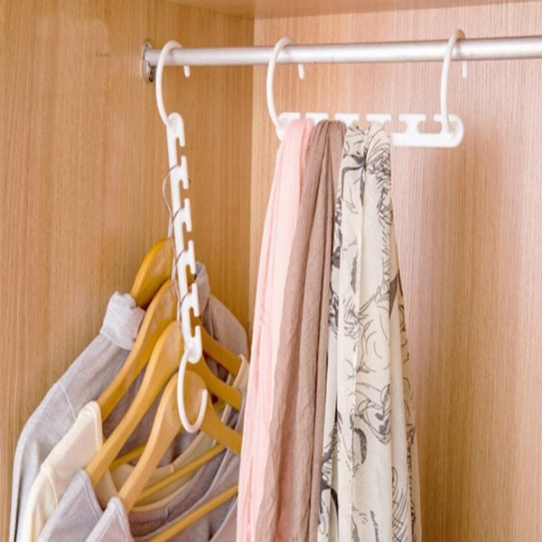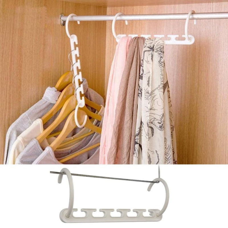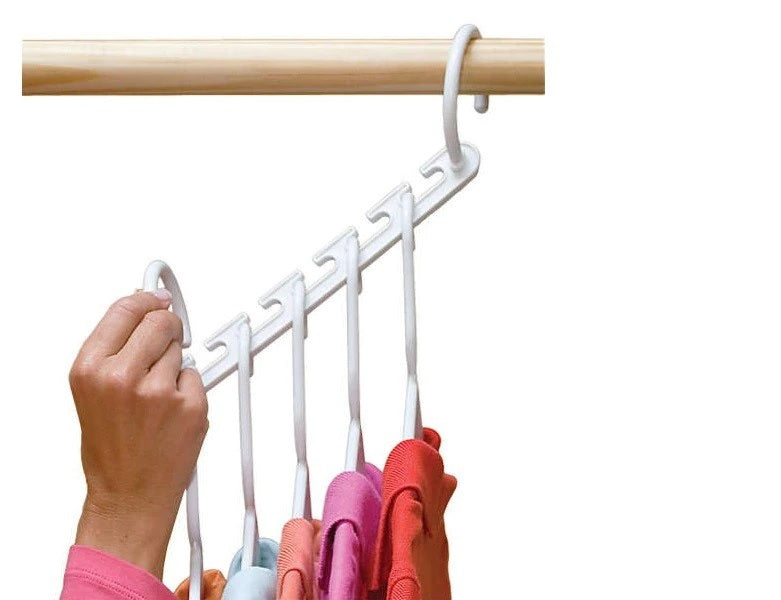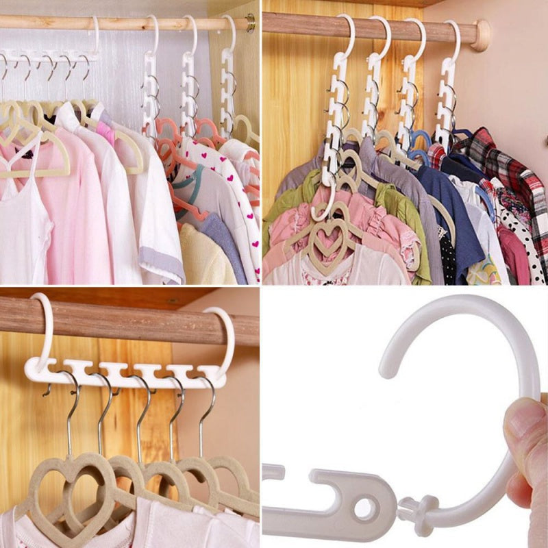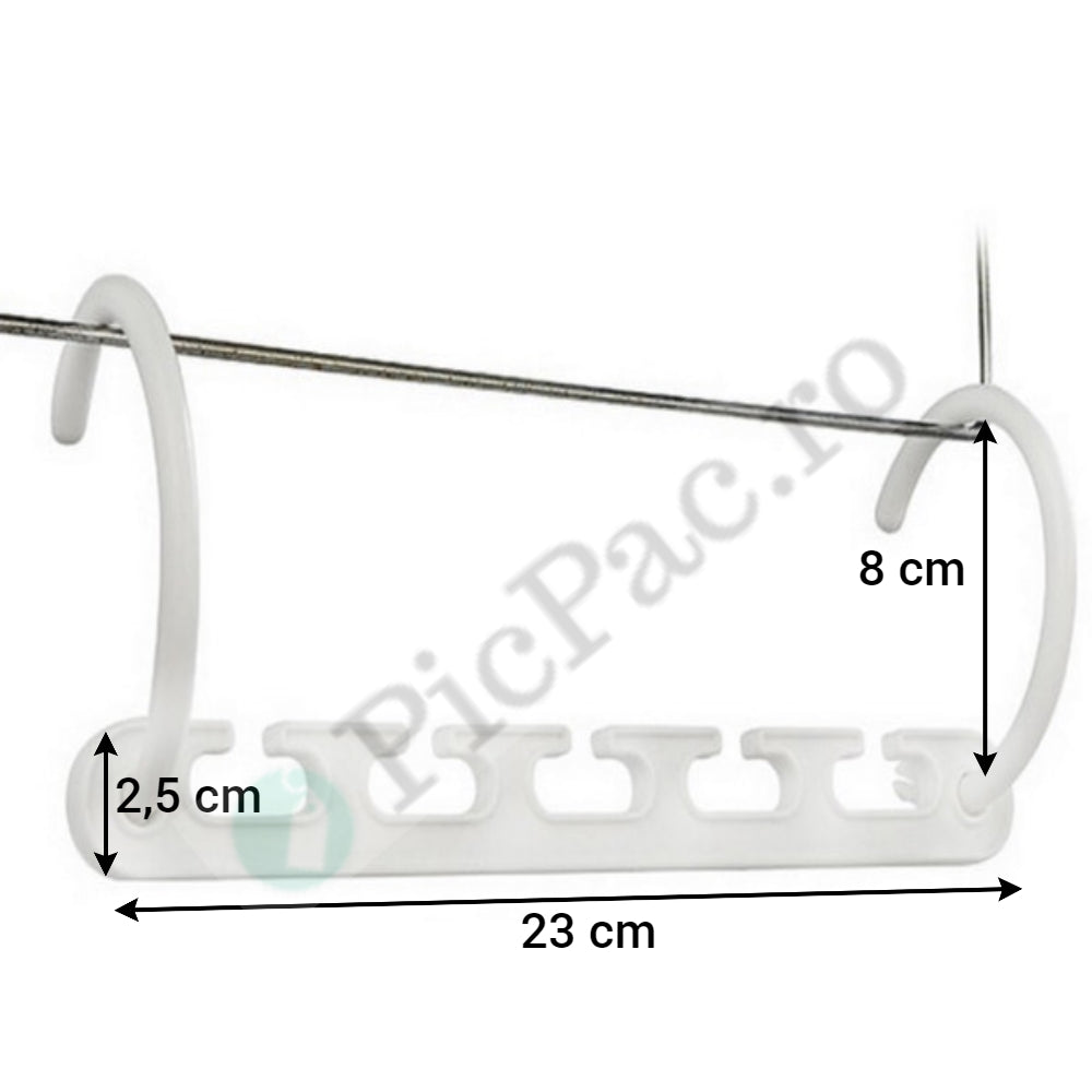 Beneficii: - Organizeaza si economiseste spatiul din debaraua sau dulapul de haine. - Setul de 8 poate sustine pana la 5 articole de imbracaminte pe fiecare, in total 40 de umerase, facand organizarea dulapului mai usoara decat inainte. - Poate sustine chiar si bagaje, posete, curele, articole de imbracaminte de sezon, etc. - Se ataseaza de bare de lemn, metal sau plastic. - Cu acest suport puteti tripla instantaneu spatiul din dulap