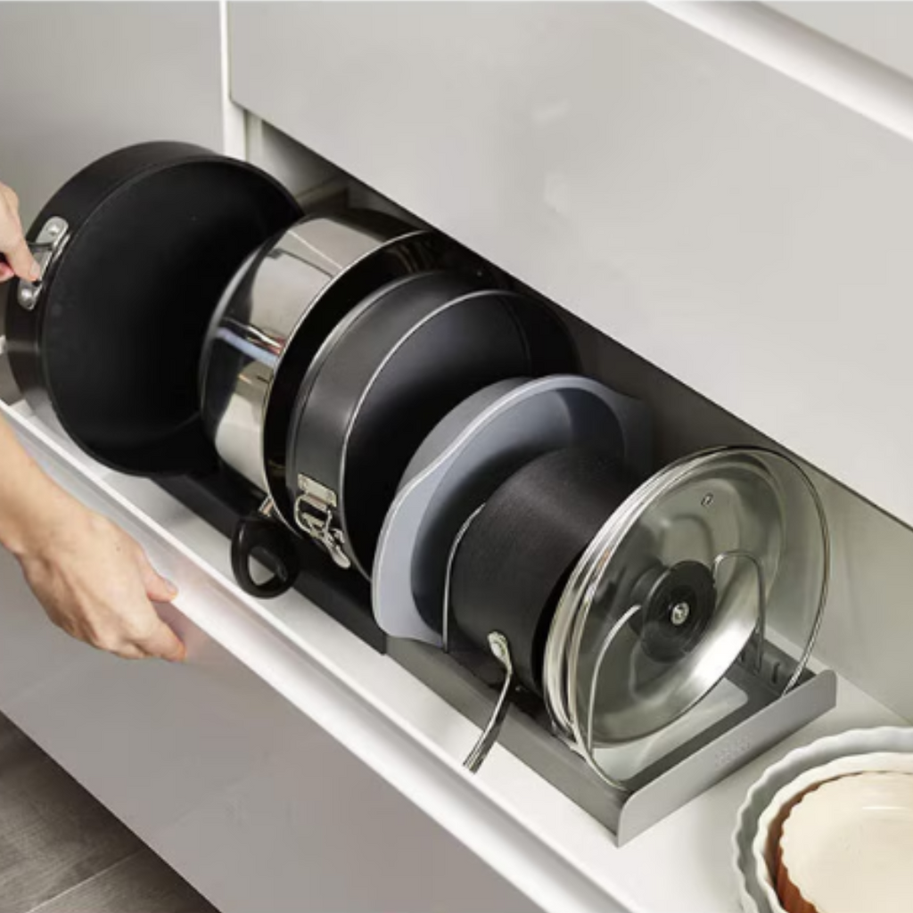 Suportul este gandit pentru a-ti maximiza spatiul. Compartimentele sale ajustabile permit depozitarea usoara a capacelor, oalelor si tigailor de diverse dimensiuni. Acum poti sa accesezi rapid si usor orice ustensila, fara a mai rascoli prin dulapuri aglomerate.