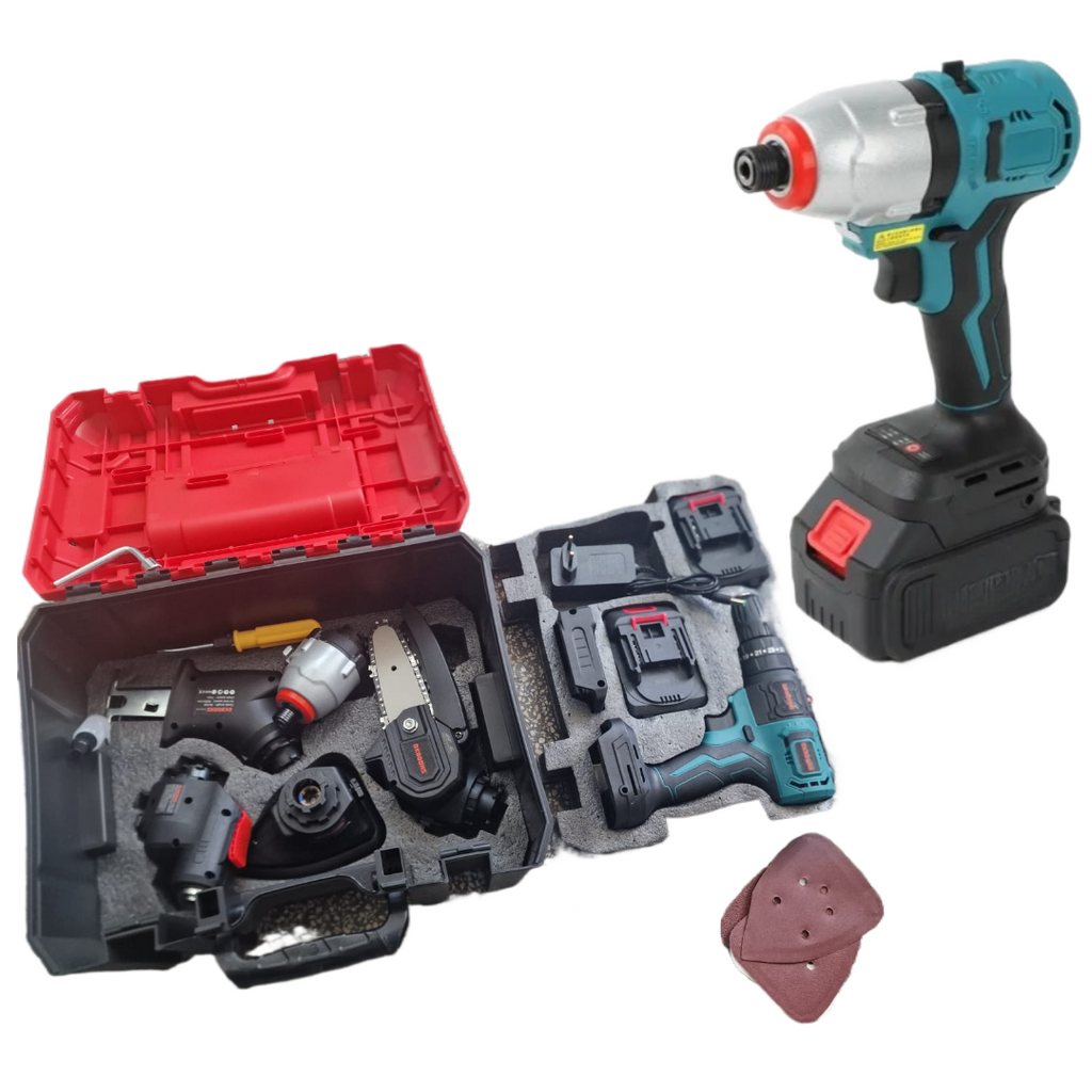 Această trusă profesională multifuncțională este concepută pentru a-ți oferi tot ce ai nevoie într-un singur set compact și portabil. Cu 6 capete interschimbabile, acumulatori puternici de 48V și accesorii esențiale, poți executa rapid și eficient orice lucrare de găurire, tăiere, polizare, șlefuire sau înșurubare.