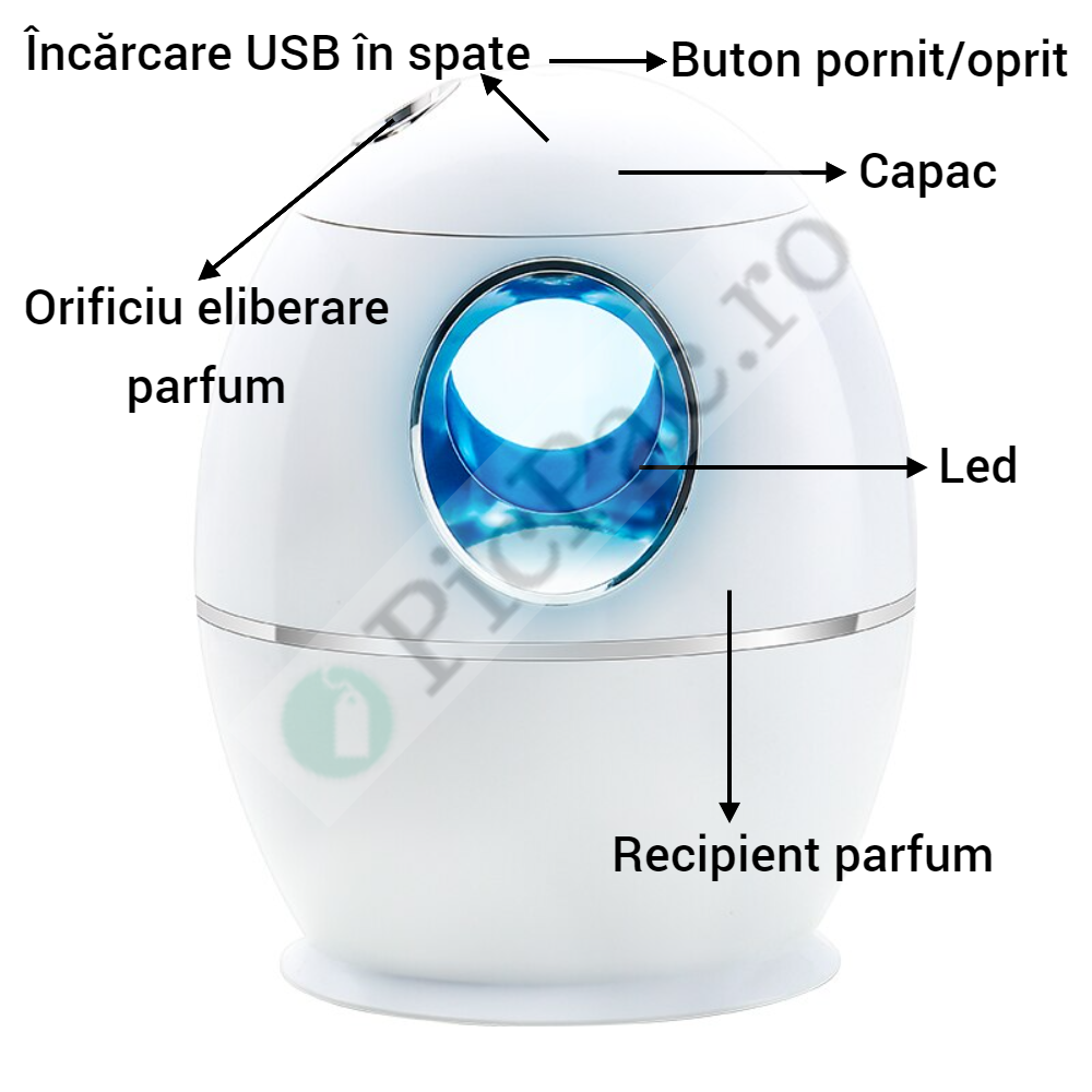 - Suprafata de umidificare: 41-60 mp, aromaterapie, acvaterapie si luminoterapie. De asemenea, poate fi folosit ca umidificator, fara uleiuri esentiale.